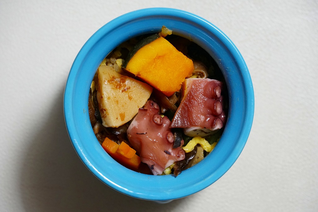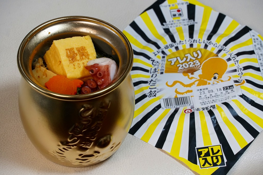 タコツボ型の陶器や掛紙のつくりは通常版と同じでも、掛紙に描いたタコも普段の3倍大きく見える。中身は味付き飯にタコ煮、錦糸卵、菜の花、椎茸煮、穴子煮、タケノコを詰め、揚げかまぼこを仕込むもので、内容は通常版と同じ。タコ煮が増えたぶん、ふたを開けたらほぼタコ。刻まれたり混ぜたりしないため、大きくて飯をほじくりにくくて食べにくいとも思うし、豪快だとも思う。
