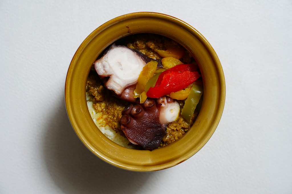 2022(令和4)年1月7日に発売。名物の駅弁「ひっぱりだこ飯」のカレー味。この駅弁は上記や下記の亜種と異なり「ひっぱりだこ飯」を名乗らなかった。正方形の掛紙といつものタコ壷がカレー色、ターメリック色になり、「〜蛸壷から漂う異国の香り。新・明石名物ここに誕生〜」とキャッチフレーズも新しい。