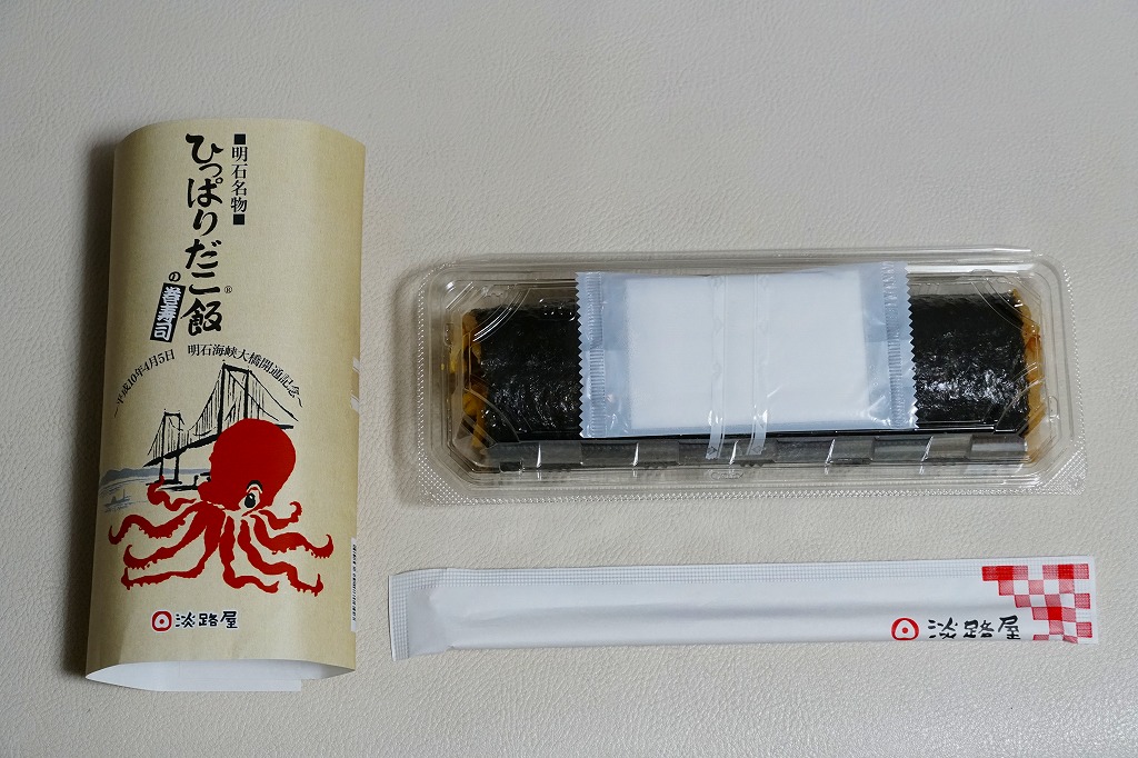 透明なプラ容器に、切らずに食べられる太さの海苔巻きが1本。その中身はひっぱりだこ飯と同じで、味付け飯にタコ煮、シイタケ煮、アナゴ煮、タケノコ煮、錦糸卵、そして揚げかまぼこまでも仕込み、掛紙も駅弁と同じ図柄。値段も含めて駅弁がかなり再現された。