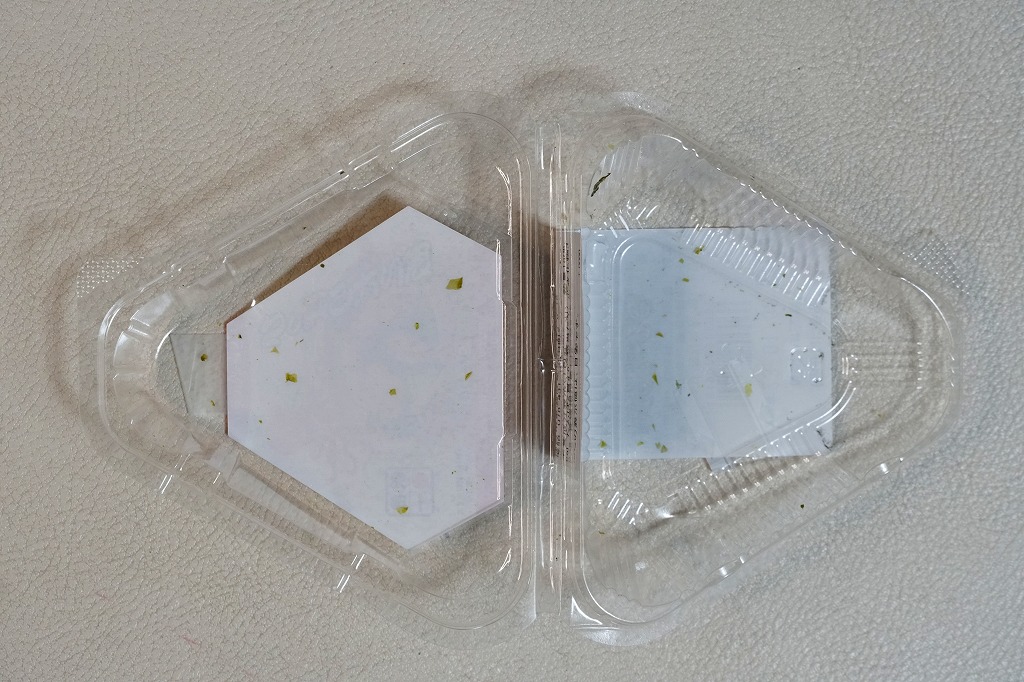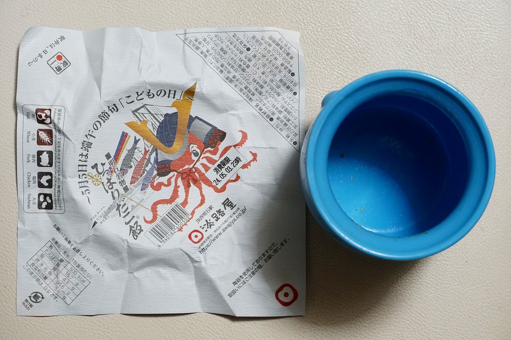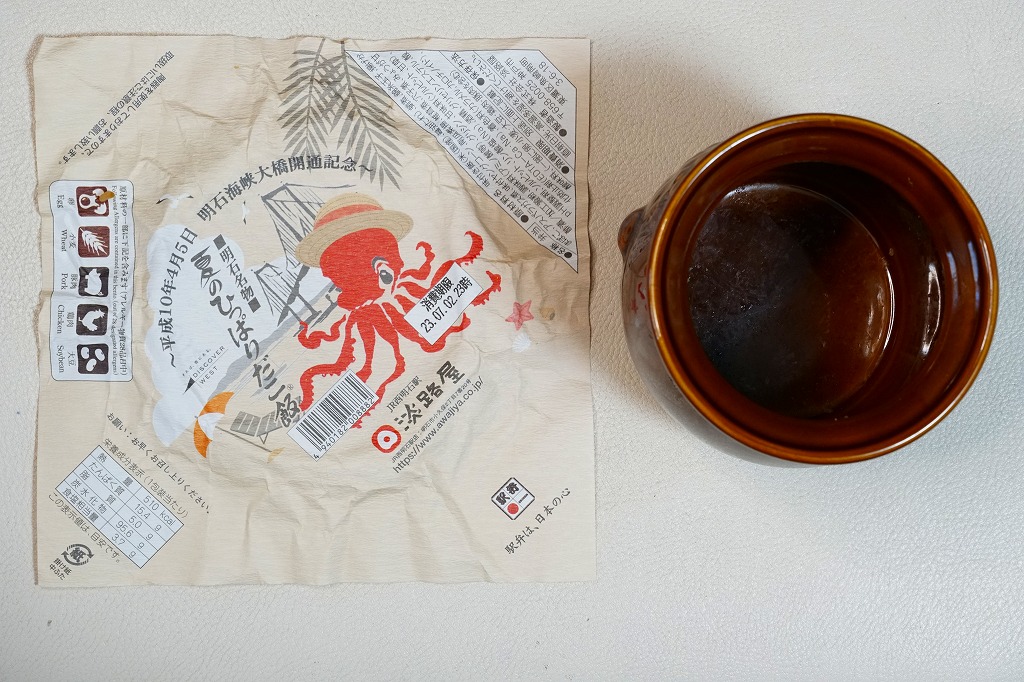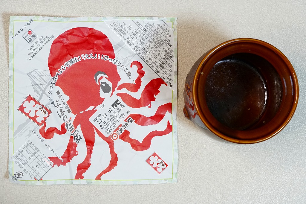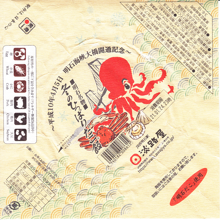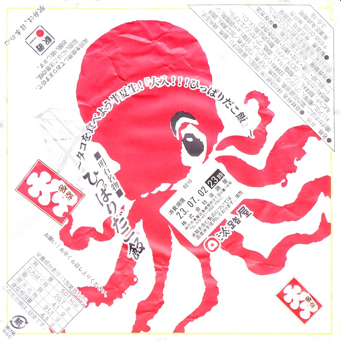 2023(令和5)年7月28日に購入した、西明石駅弁の掛紙。上記の「夏のひっぱりだこ飯」と同じ月に買ったので、掛紙もタコツボ容器も中身も味も同じもの。兵庫県神戸の調製元は2022年8月に東京都足立区へ東京工場を設け、東京駅などで売る駅弁を東京で作るようになった。消費期限の表記を現地版の印字でなくシールとし、そこに東京工場の名前と所在地を記した。