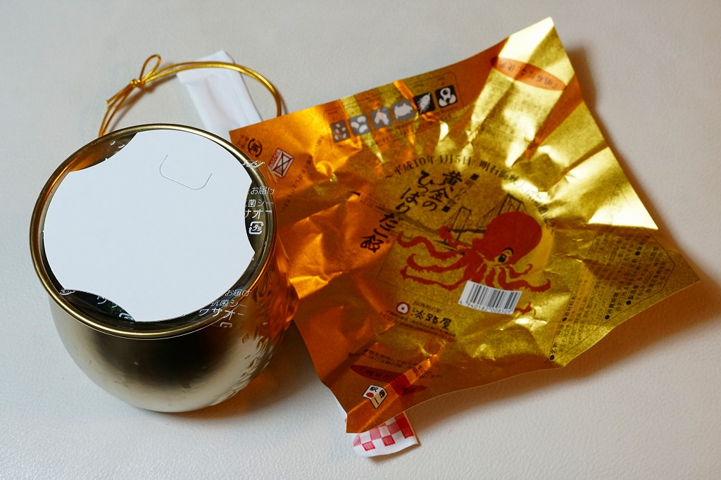 この催事では「黄金」とこれと通常版で、3種のひっぱりだこ飯を実演販売。この年の夏には東京五輪が開催予定で、後に政府の新型コロナウイルス感染症対策により開催が延期されてしまったが、催事場では五輪にちなんだと思われるような駅弁が出てきていた。ここでは黄金と銀色と、銅色にも見える通常版を、表彰台のような段違い台に並べた写真を調製元がSNSに投稿しており、なるほどなと思った。半世紀前の東京五輪当時と違い、今は権利が強大なので、五輪に関する記述は催事のチラシにも催事場にも、どこにもなかった。