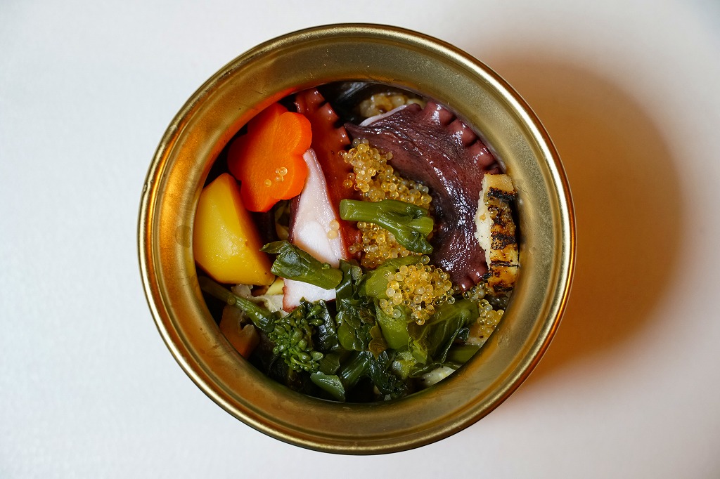金色に染めた陶製タコ壷容器に、タコやシイタケを混ぜた醤油飯を詰め、タコ煮、菜の花、刻み煮穴子で覆い、揚げかまぼこを仕込むまでは、通常版と同じ。これにクリとトビコと金胡麻を加えて黄金を演出し、価格を300円、「金色」よりも30円上げた。だから味やその印象もまた、おおむね通常版と同じだった。
