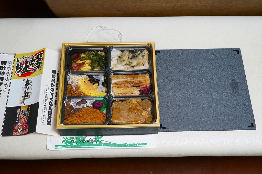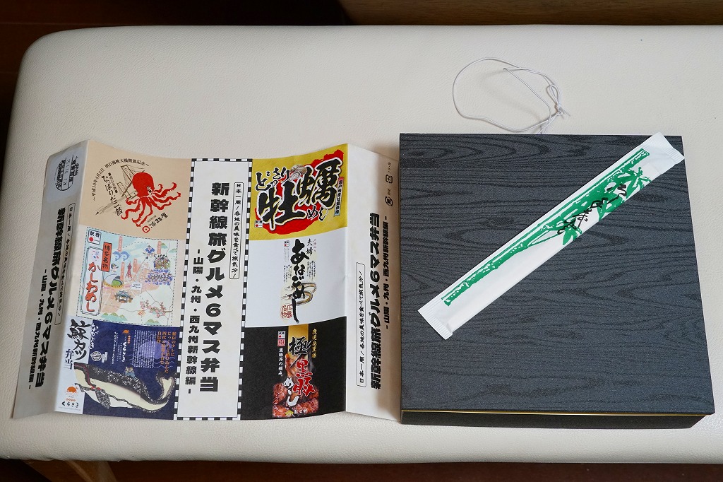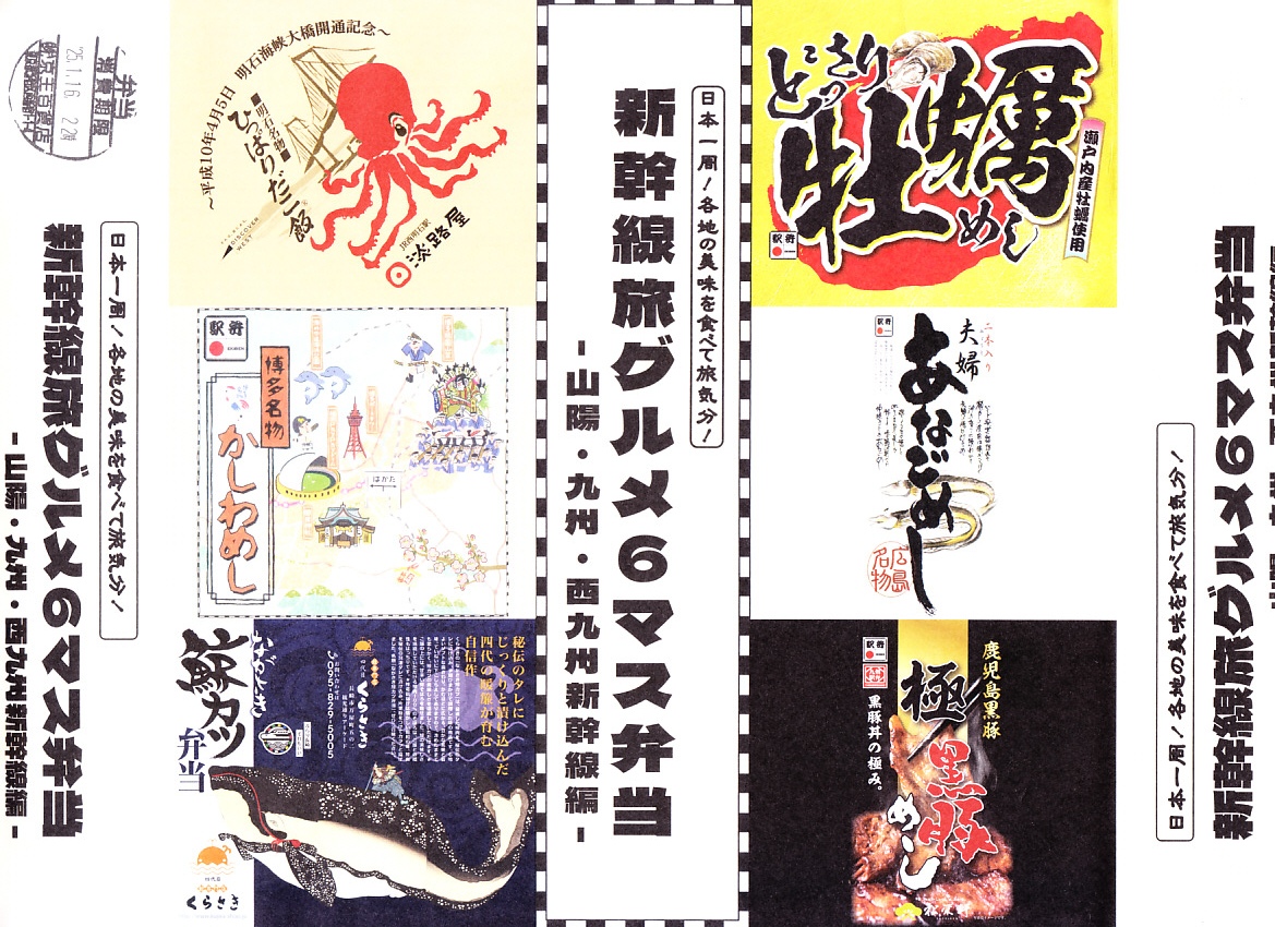 2025(令和7)年1月の京王百貨店の駅弁大会で販売。同大会の60回を記念し、新幹線の停車駅で販売している各地域の駅弁を6マスに詰めた弁当を実演販売した。これは東海道新幹線、上越・北陸新幹線、北海道・東北・山形新幹線、山陽・九州・西九州新幹線の4種類のうち「山陽・九州・西九州新幹線編」で、西明石駅「ひっぱりだこ飯」、姫路駅「どっさり牡蠣めし」、博多駅「かしわめし」、広島駅「夫婦あなごめし」、長崎駅「ながさき鯨カツ弁当」、出水駅「極黒豚めし」の詰合せ。掛紙はその6種類の駅弁の絵柄の組合せで、大きな正方形の容器に6個のプラ製トレーを同じ大きさで詰め、それぞれの中身をミニサイズに収めた。ここでの筆頭は西明石駅「ひっぱりだこ飯」で、その中身から飯とタコと菜の花と錦糸卵を取り出した。