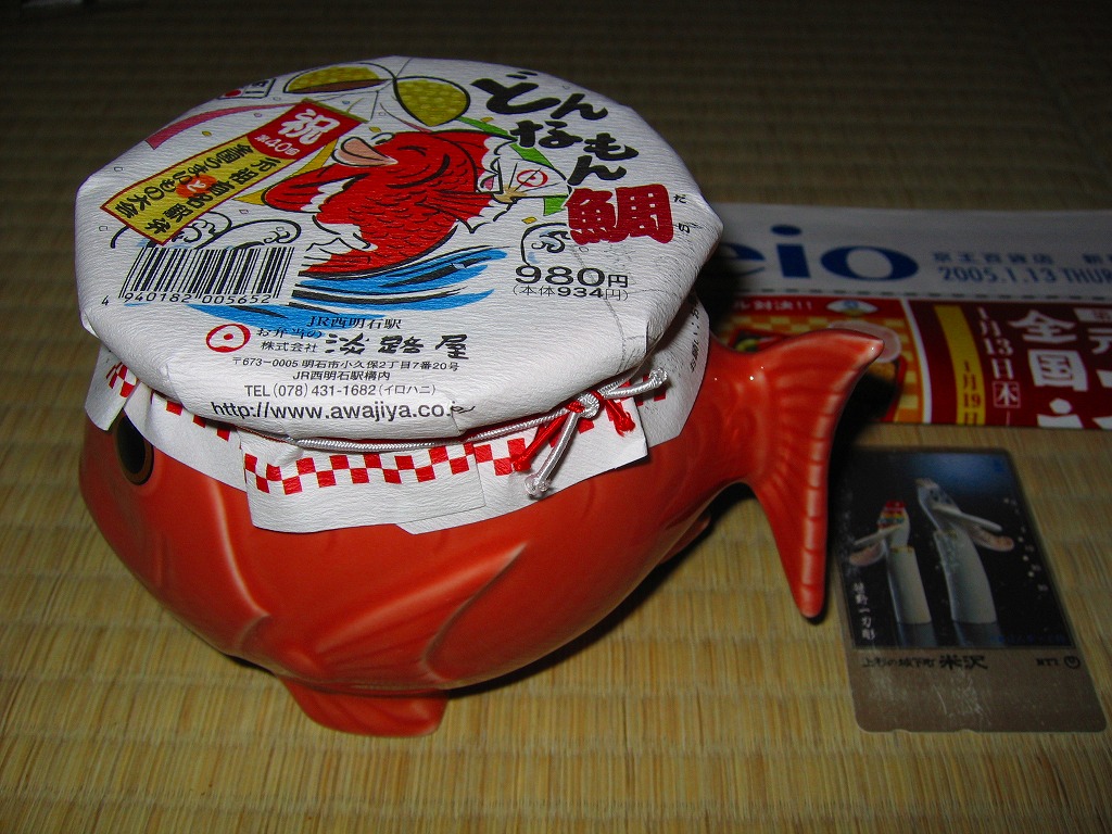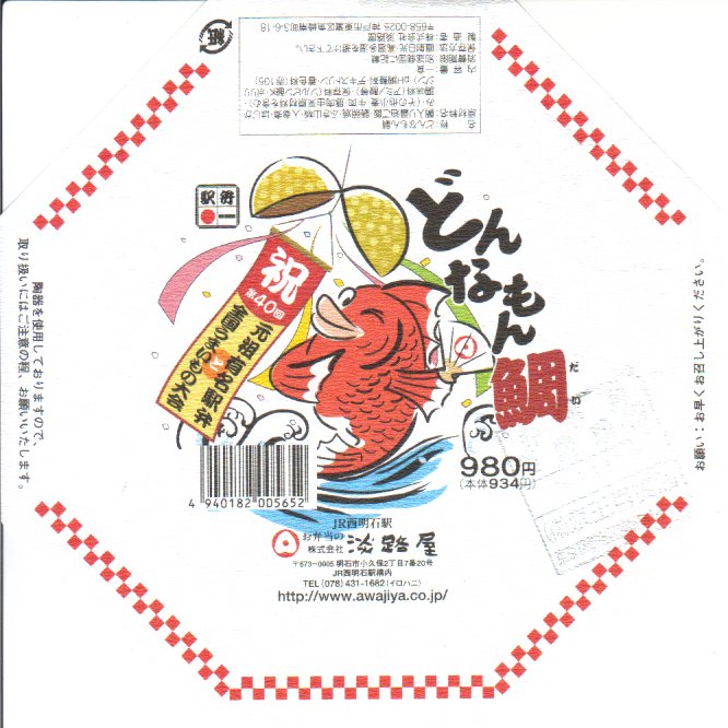 京王百貨店駅弁大会の第40回を記念して、2005(平成17)年1月に発売し、二週間で消滅。上の「めでっ鯛飯」とほぼ同型で色違いの陶製容器に掛紙をかけて紅白のゴムでしばる。中身は鯛の出し汁で炊いた御飯に鯛の身をまぶす、つまり「めでっ鯛飯」の小鯛酒蒸しが焼き鯛に変わっただけか。鯛味噌がチューブで付属。