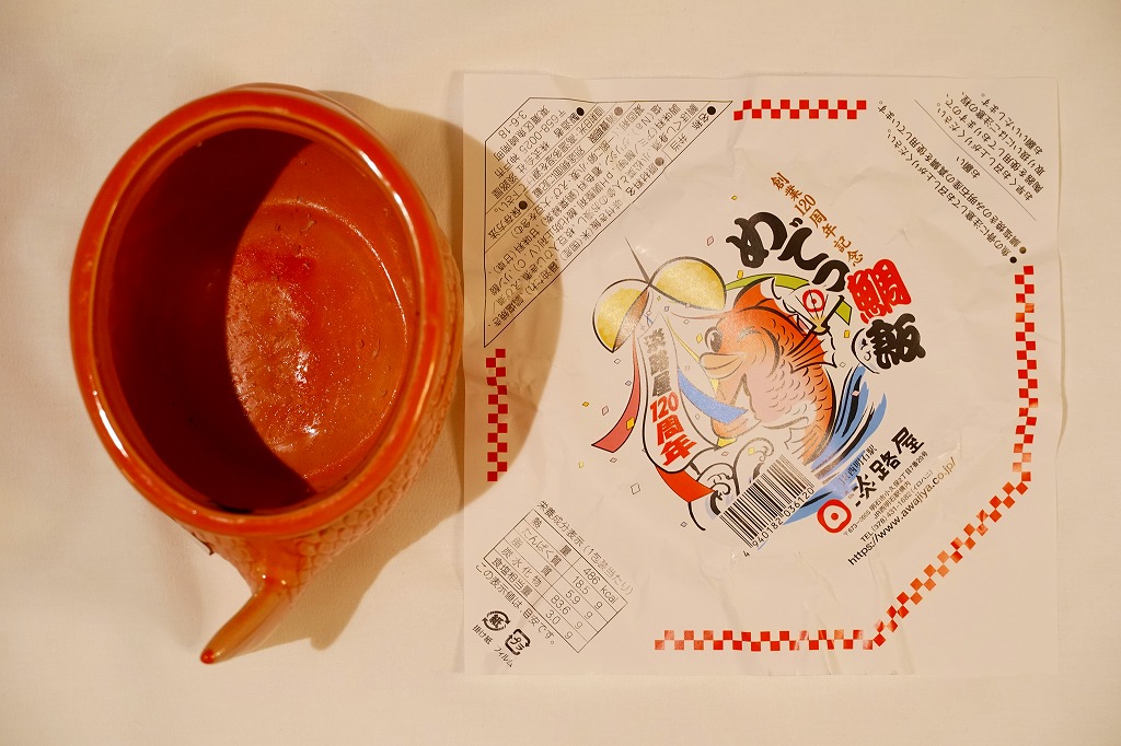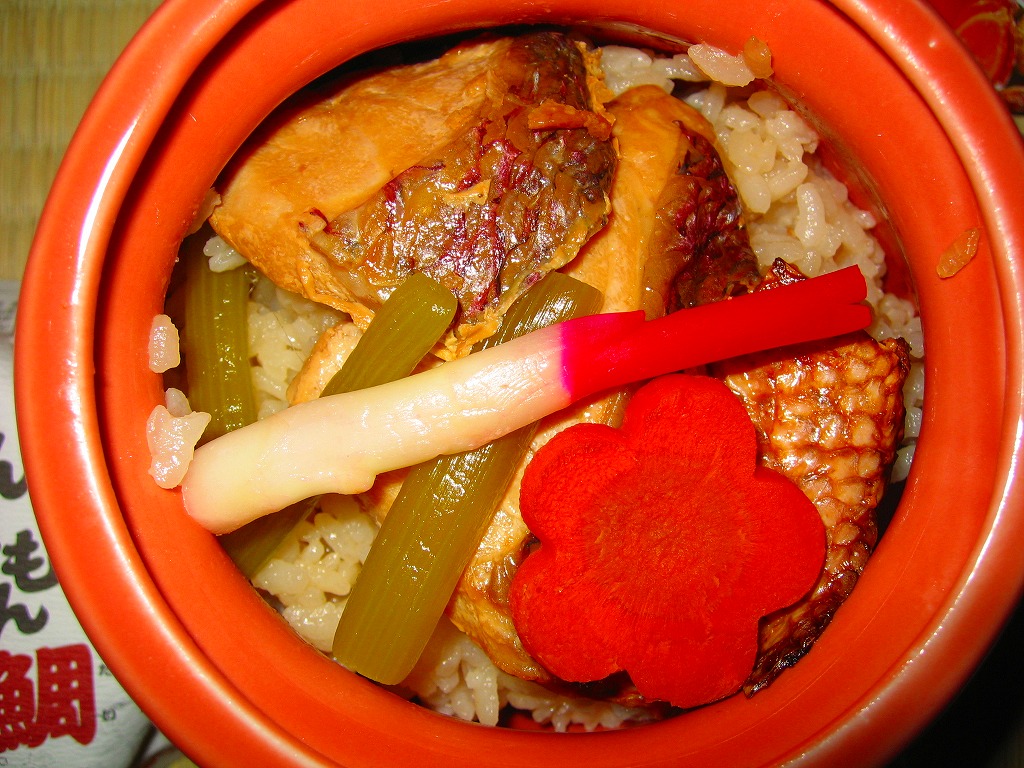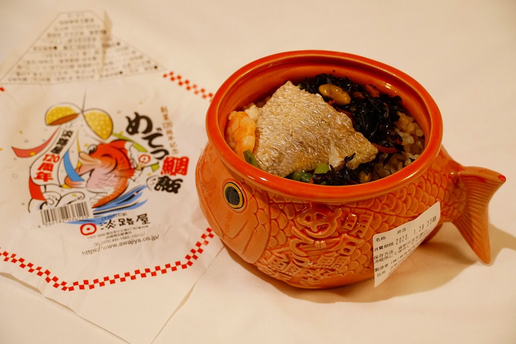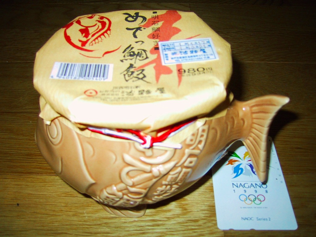 1999(平成11)年に発売。尻尾の付いたユーモラスな形の陶器を容器に使用、鯛の骨で出汁を取り鯛の子を混ぜた炊き込み御飯の上に、小鯛の酒蒸しを、錦糸卵や菜の花和えとともに載せる。現在は販売されていない模様。
