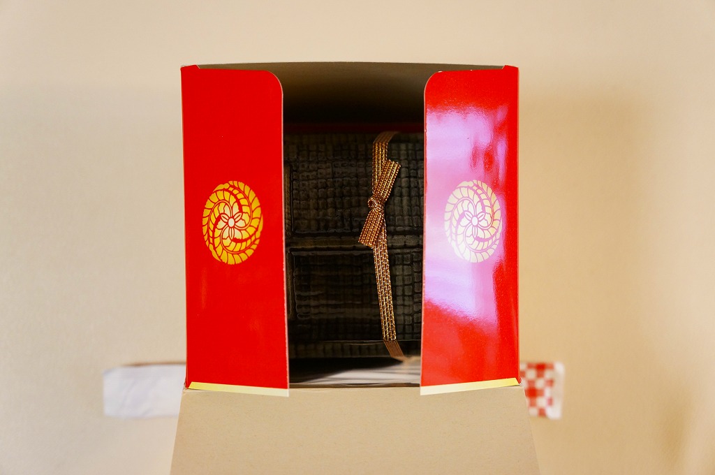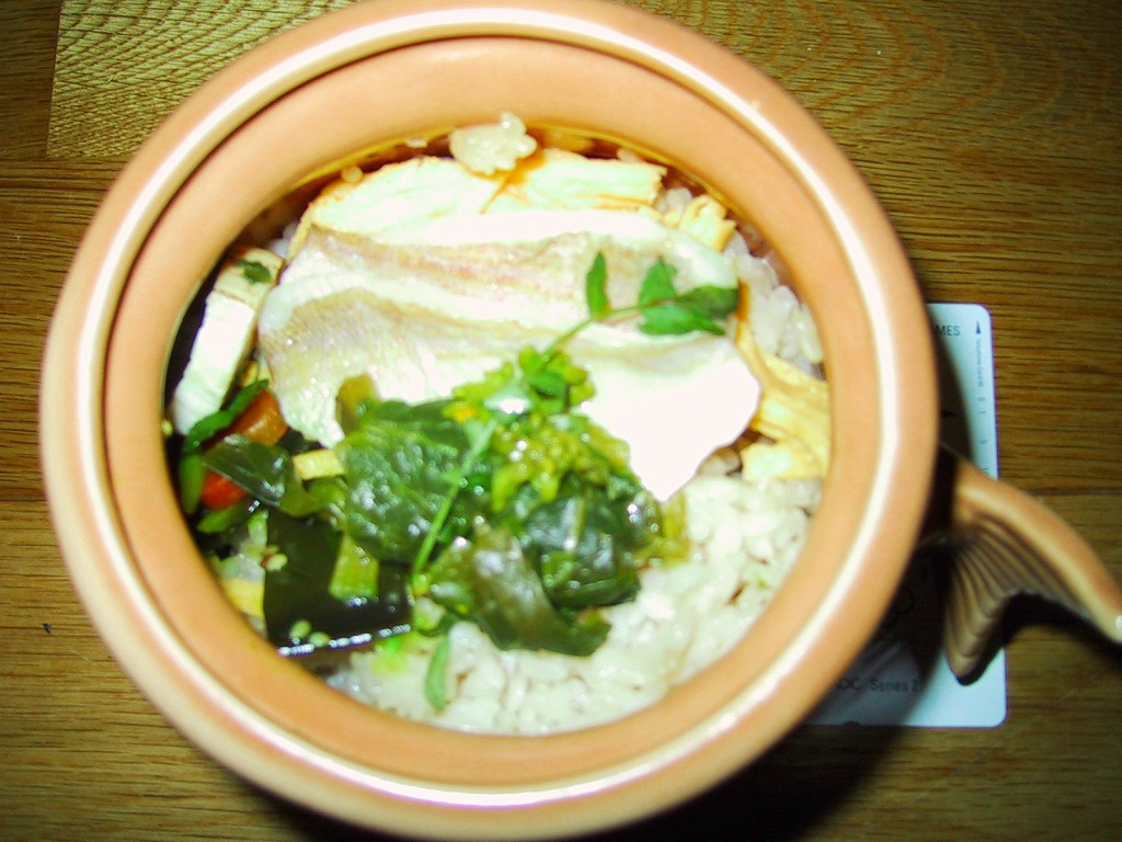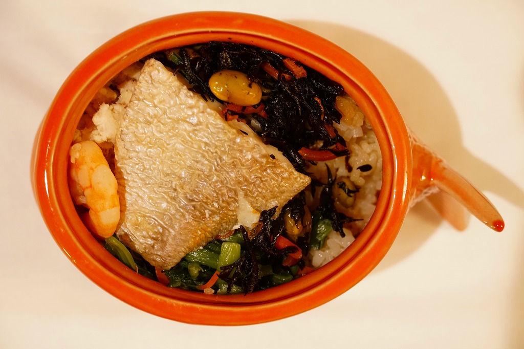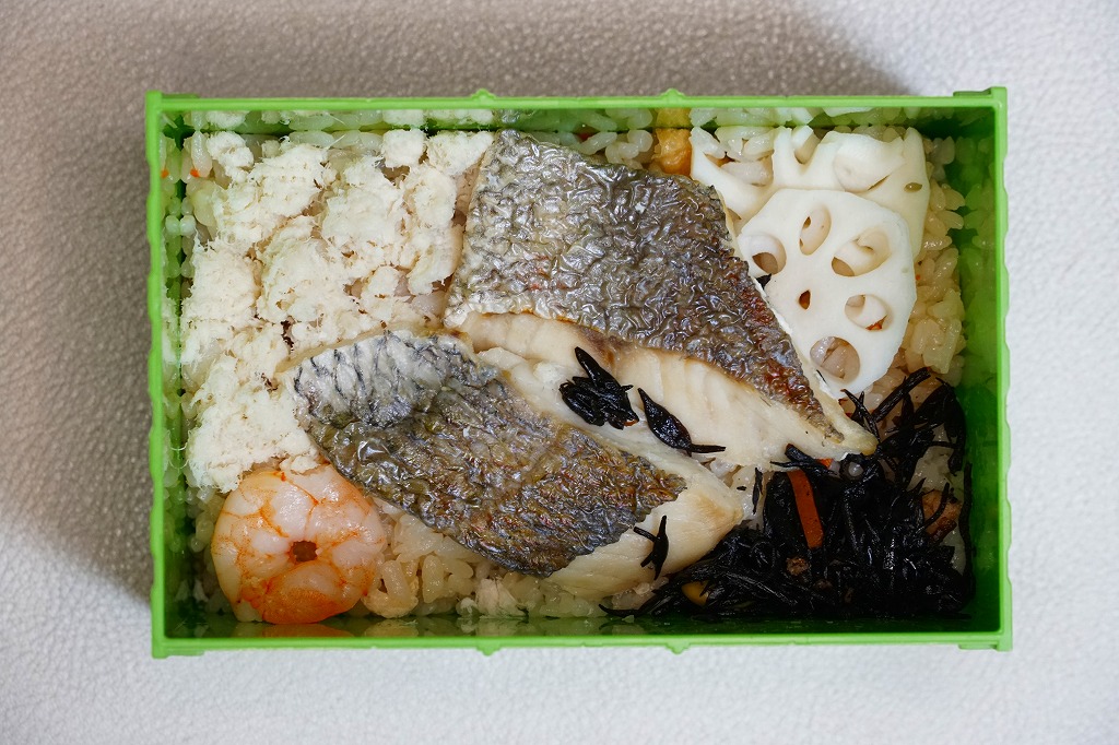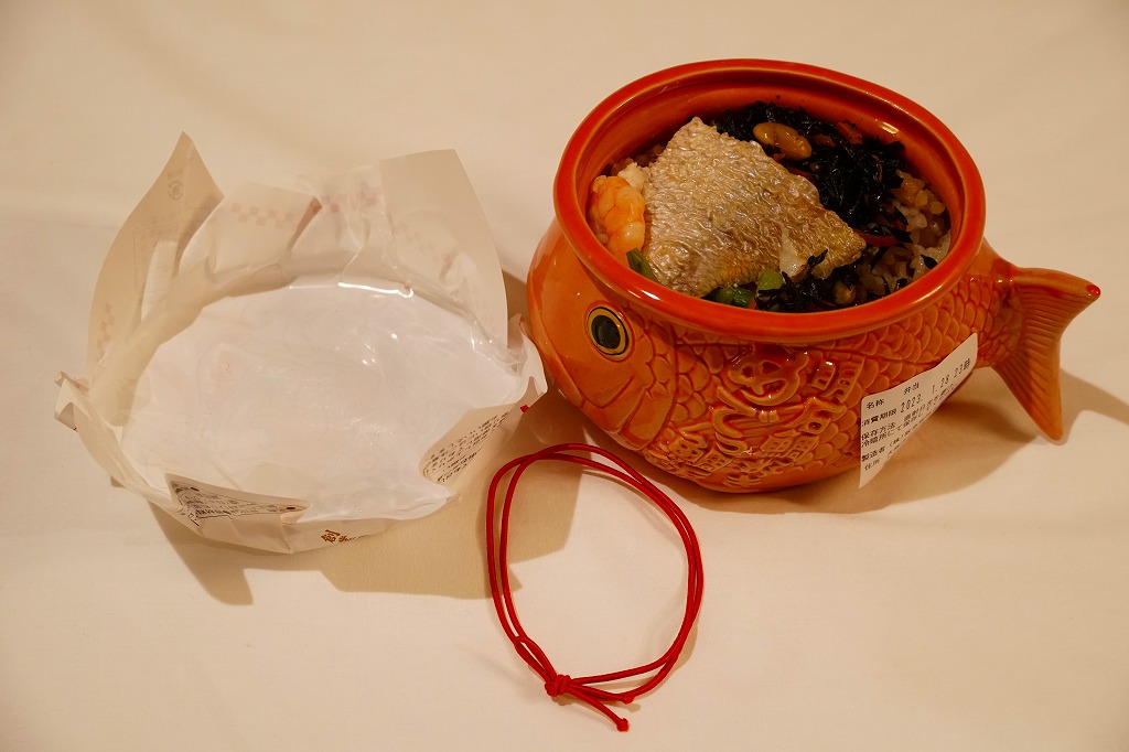 1999(平成11)年に発売。尻尾の付いたユーモラスな形の陶器を容器に使用、鯛の骨で出汁を取り鯛の子を混ぜた炊き込み御飯の上に、小鯛の酒蒸しを、錦糸卵や菜の花和えとともに載せる。現在は販売されていない模様。