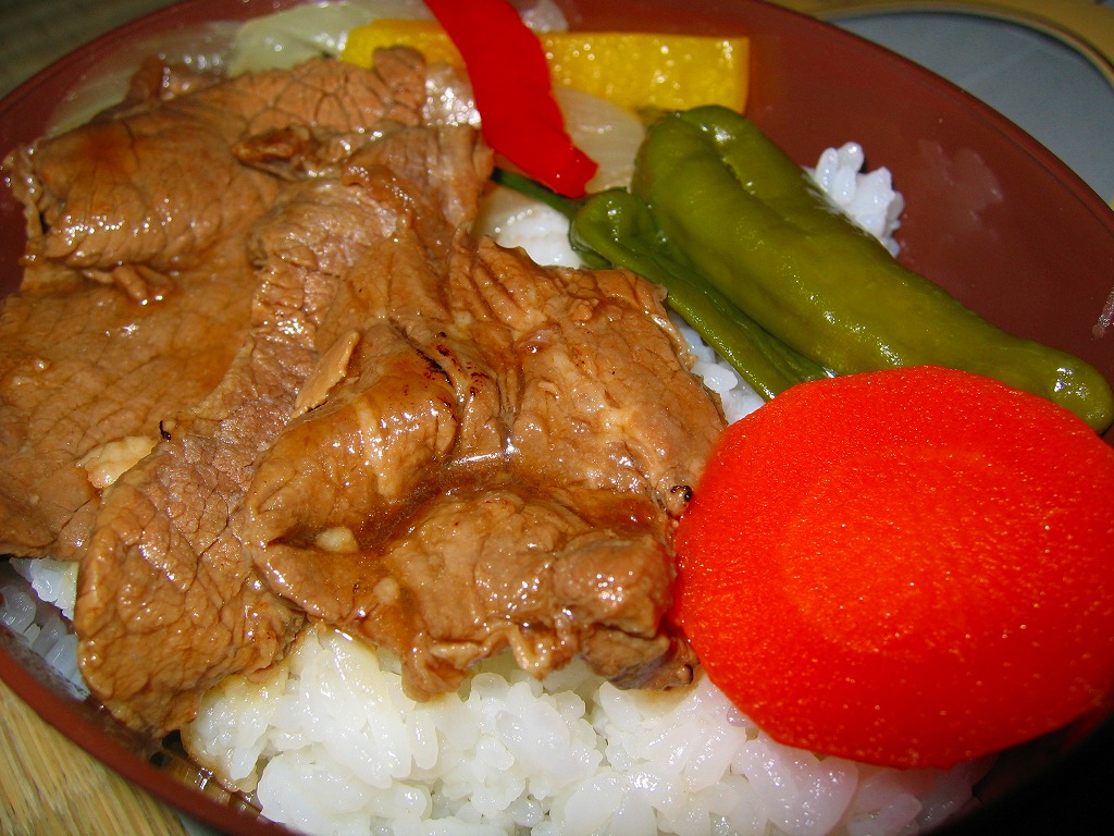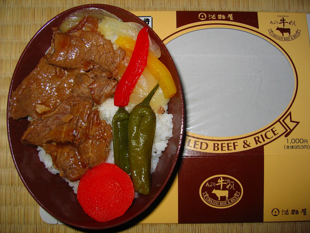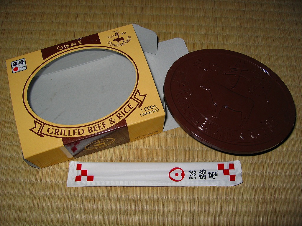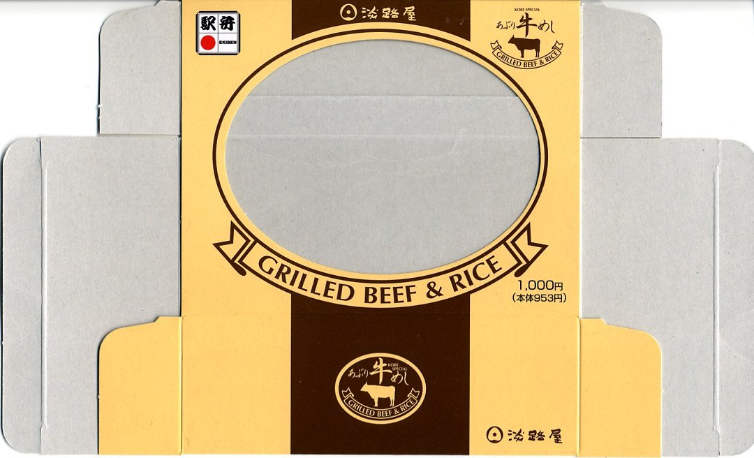2005(平成17)年の秋に発売。牛の文字とシルエットを浮き彫りにした、楕円形の小さくビーフ色なプラ容器を、窓開きな紙箱に収める。中身は白御飯の上に牛焼肉、タマネギやパプリカの炒め物、ししとう、甘いニンジンを載せるもの。