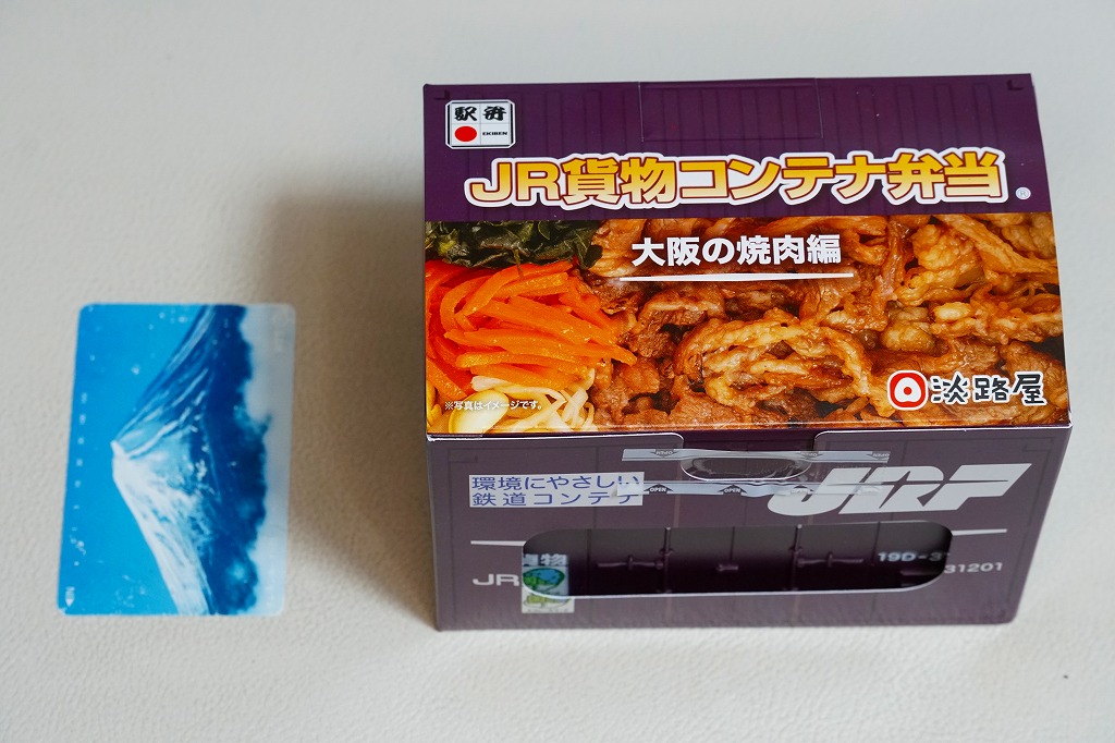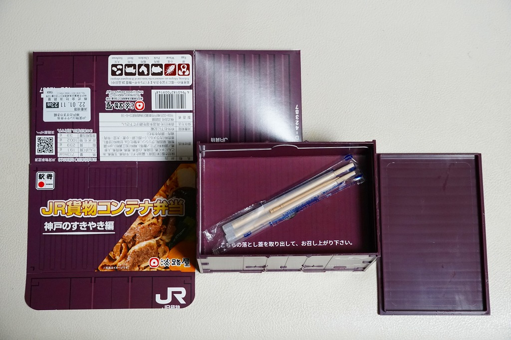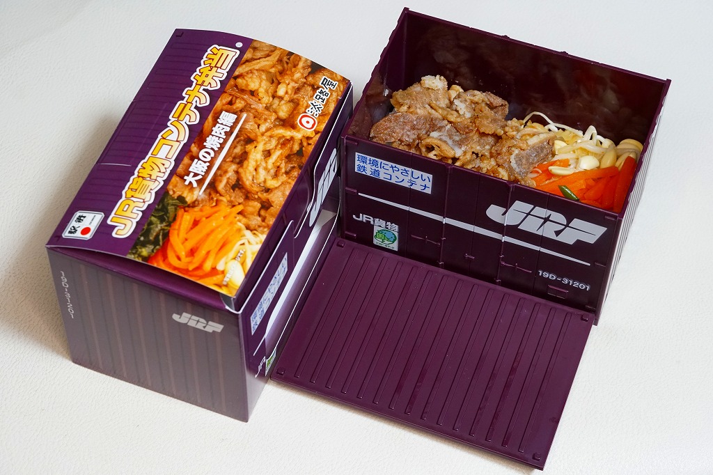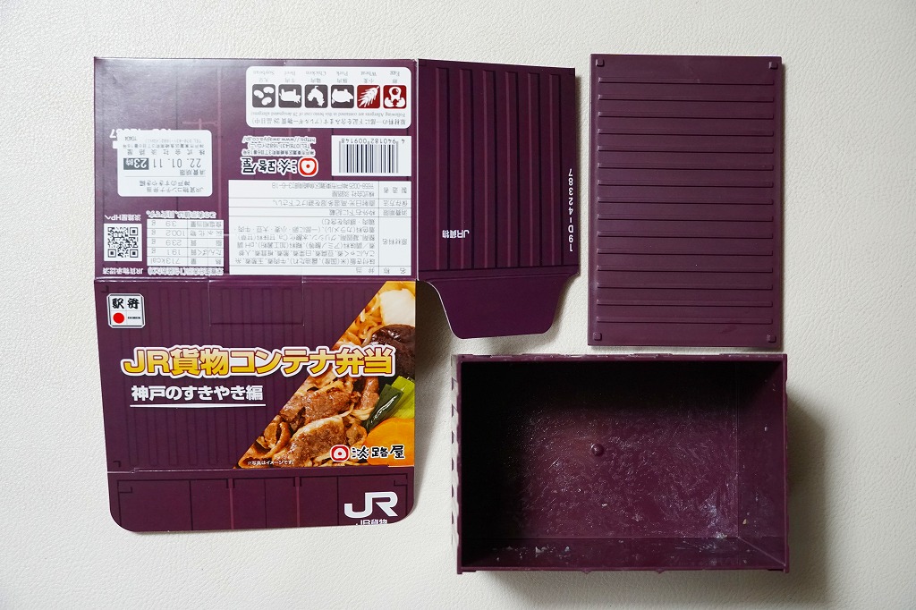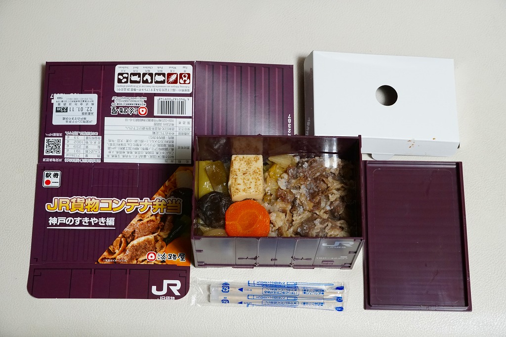 2022(令和4)年1月1日に発売。鉄道貨物の駅弁は史上初かもしれない。実在するJR貨物の鉄道貨物輸送向けコンテナ「19D−42387」の形状と塗装を模したプラ容器を、同じ絵柄の紙箱にぴったり収める。JR貨物承認済の商品で、ふたを開けると全国地図を用いたJR貨物の鉄道貨物輸送の紹介が現れる。中身は「神戸のすきやき編」ということで、味付き飯を牛すき焼きで覆う、常温向け洋食風な、いつもの神戸駅弁の内容と風味。