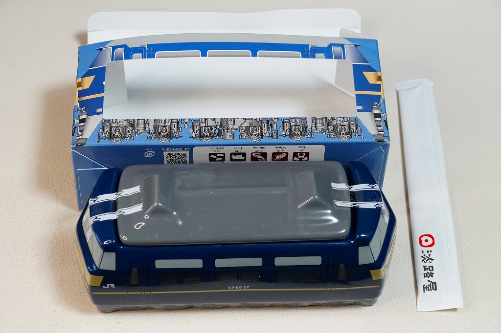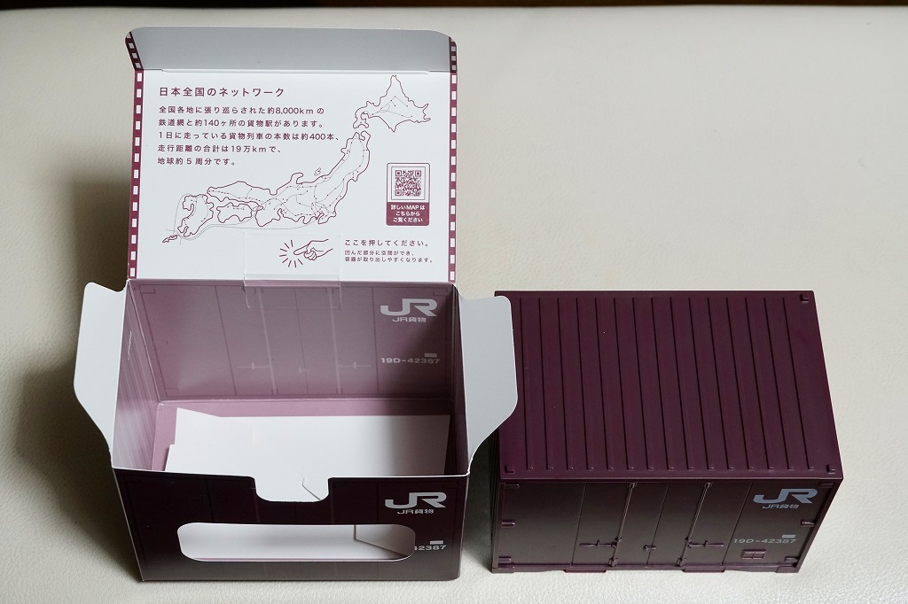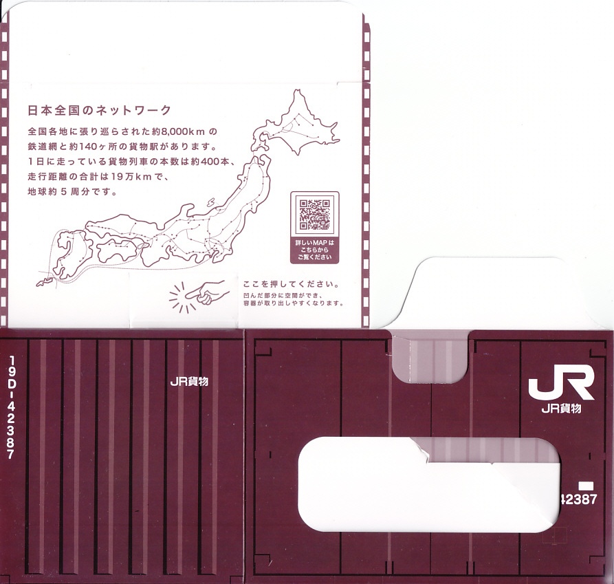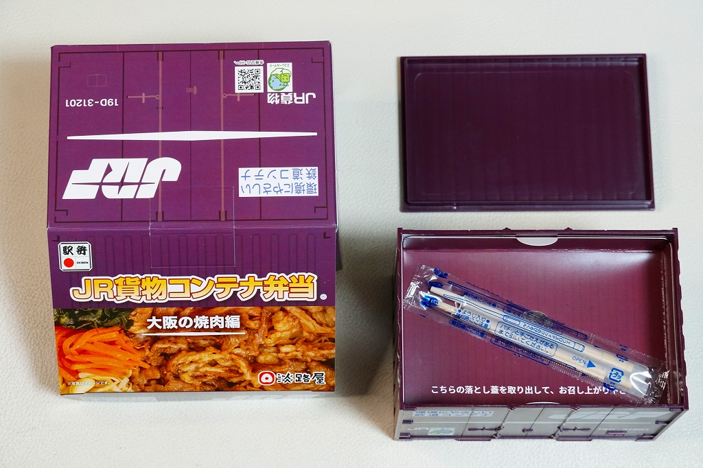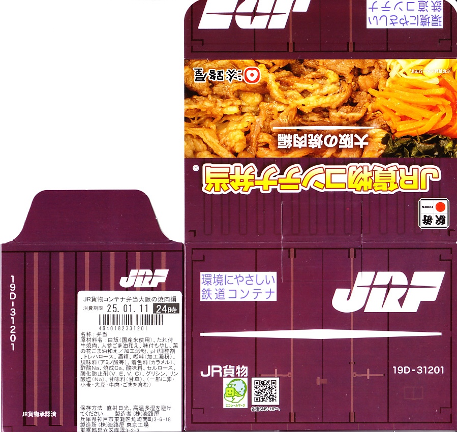 2022(令和4)年1月1日に発売。鉄道貨物の駅弁は史上初かもしれない。実在するJR貨物の鉄道貨物輸送向けコンテナ「19D−42387」の形状と塗装を模したプラ容器を、同じ絵柄の紙箱にぴったり収める。JR貨物承認済の商品で、ふたを開けると全国地図を用いたJR貨物の鉄道貨物輸送の紹介が現れる。中身は「神戸のすきやき編」ということで、味付き飯を牛すき焼きで覆う、常温向け洋食風な、いつもの神戸駅弁の内容と風味。