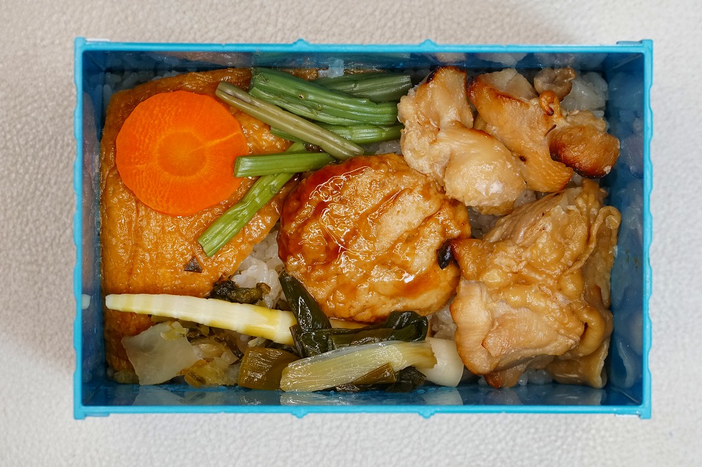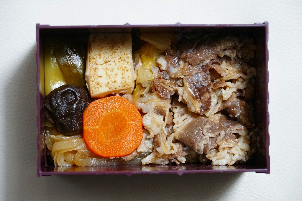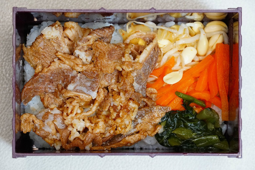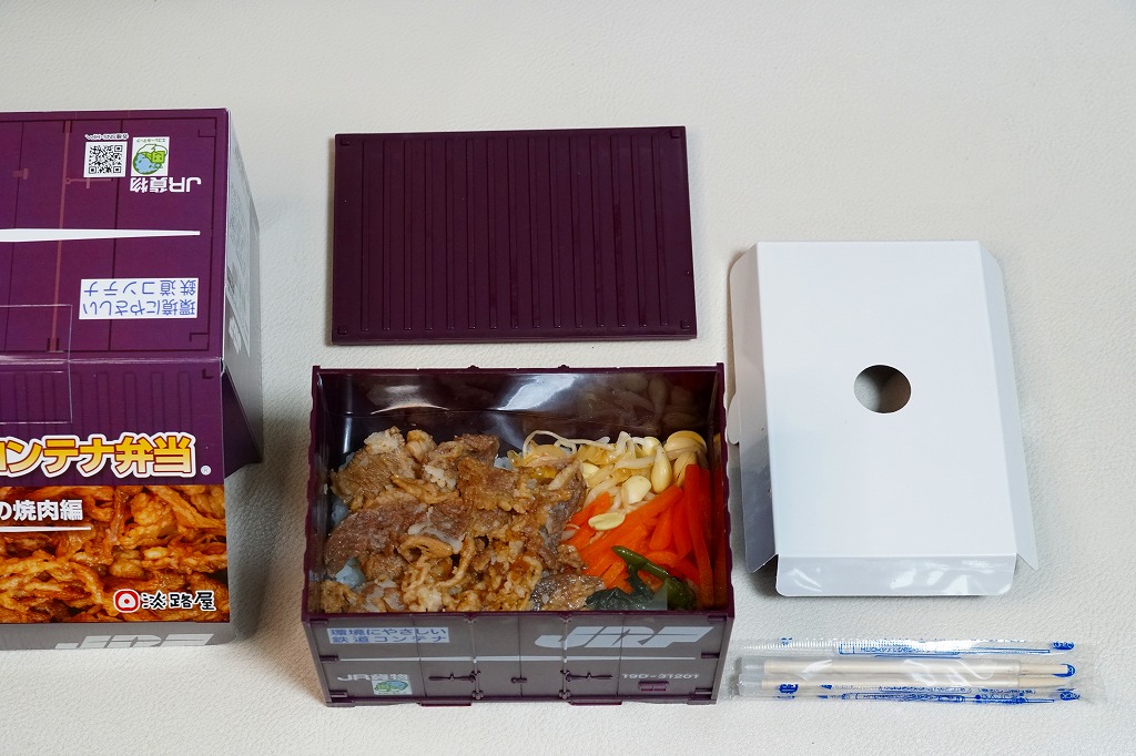 ふたを開けると全国地図を用いたJR貨物の鉄道路線図と貨物列車の紹介文は前回と同じ。中身は「大阪の焼肉編」ということで、白飯をたれ付き牛焼肉、にんじんのごま油和え、味付もやし、菜の花のごま油和えで覆う牛焼肉丼。ここまで4種類のJR貨物コンテナ弁当はすべて販売中で、今回の京王百貨店の駅弁大会では全種類が輸送販売された。