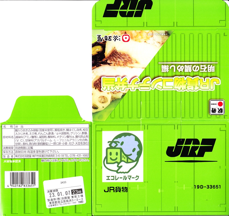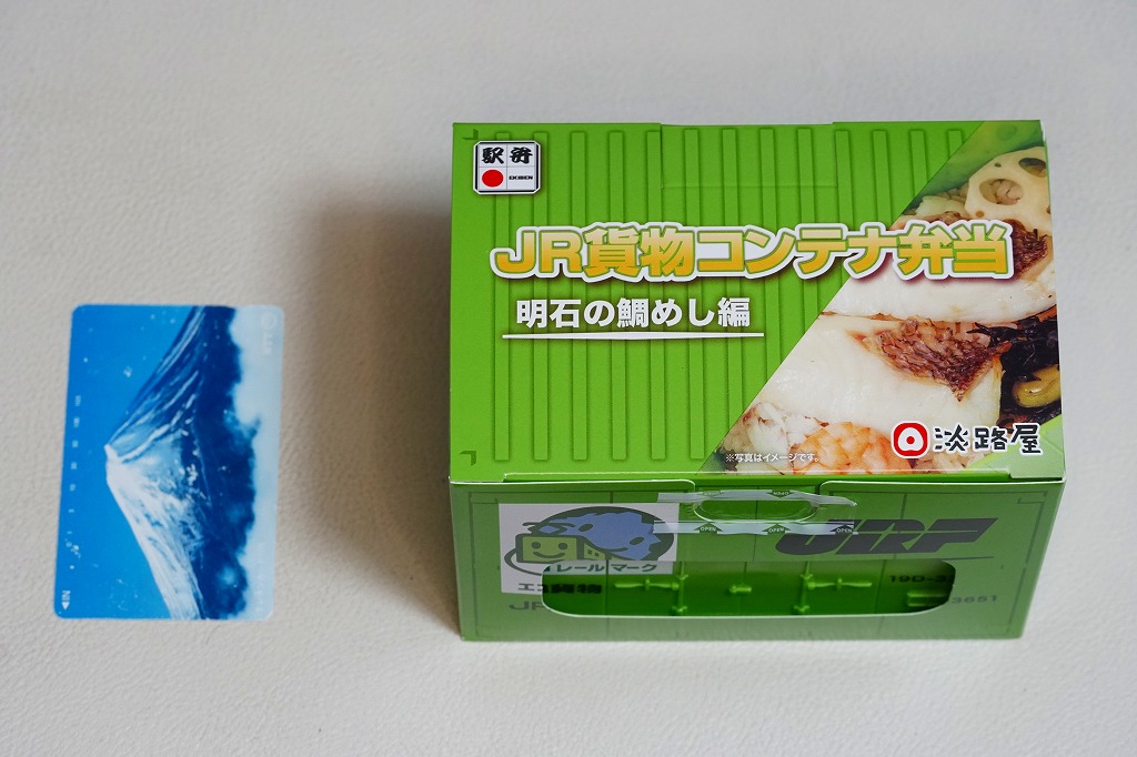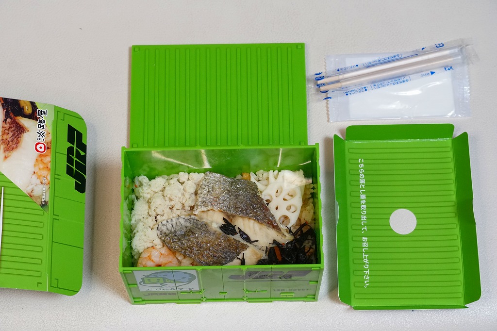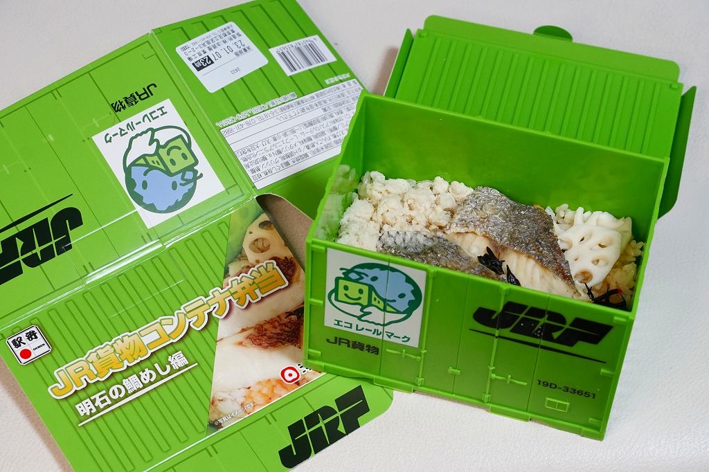 2023(令和5)年1月7日に発売。前年1月に発売した下記「神戸のすきやき編」に続く、JR貨物コンテナ弁当の第2弾。今回も実在するJR貨物の鉄道貨物輸送向けコンテナ「19D−33651」の形状と塗装を模したプラ容器を、同じ絵柄の紙箱にぴったり収める。JR貨物承認済の商品で、ふたを開けると全国地図を用いたJR貨物の鉄道路線図と、この緑色のコンテナの紹介文が現れる。中身は「明石の鯛めし編」ということで、鯛入り炊き込み御飯を、鯛塩焼きと鯛ほぐし身煮で覆い、れんこん、えび、ひじきを添える。明治時代から東海道本線の駅弁で親しまれる鯛飯から、甘みを抜いた以外は同じようなもの。価格は2023年の発売時で1,600円、2024年時点で1,680円、2025年時点で1,780円。
