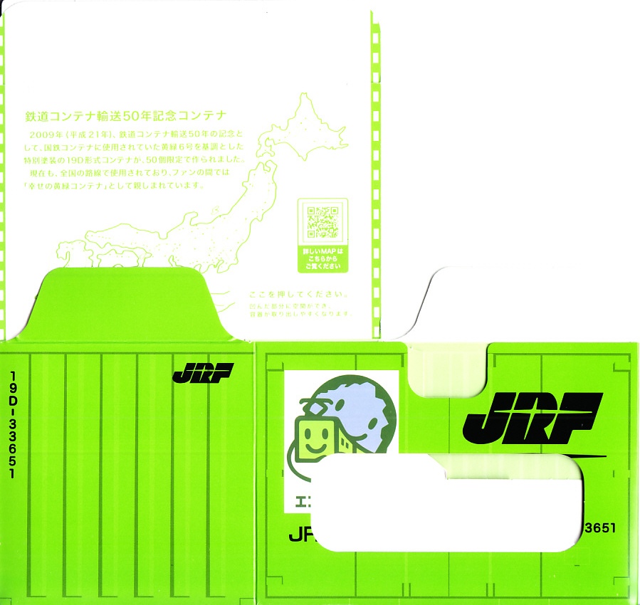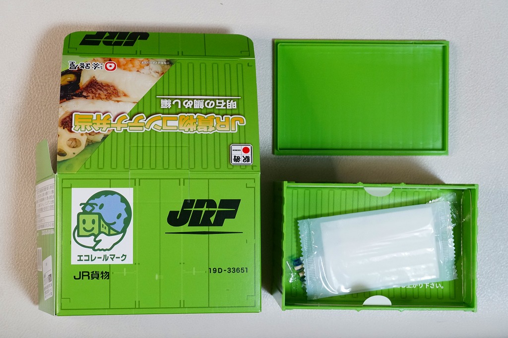 この駅弁で模した鉄道コンテナは、2009年に50個を製作。日本国有鉄道の本格的な鉄道コンテナ輸送のさきがけとなった、貨物列車「たから号」が運転を開始した1959(昭和34)年11月5日から50年目となることを記念する行事の一環として、JR貨物がこの年に購入した19D形式鉄道コンテナのうち50個を、国鉄時代の緑色に塗った。絵柄は当時のJR貨物の標準的なもので、国鉄時代のものとは異なる。1%以下の確率で、このコンテナを載せた貨物列車が見つかるかも。
