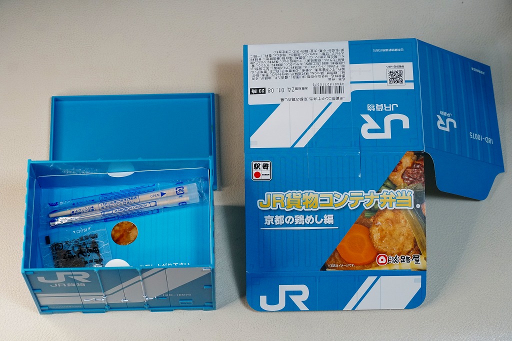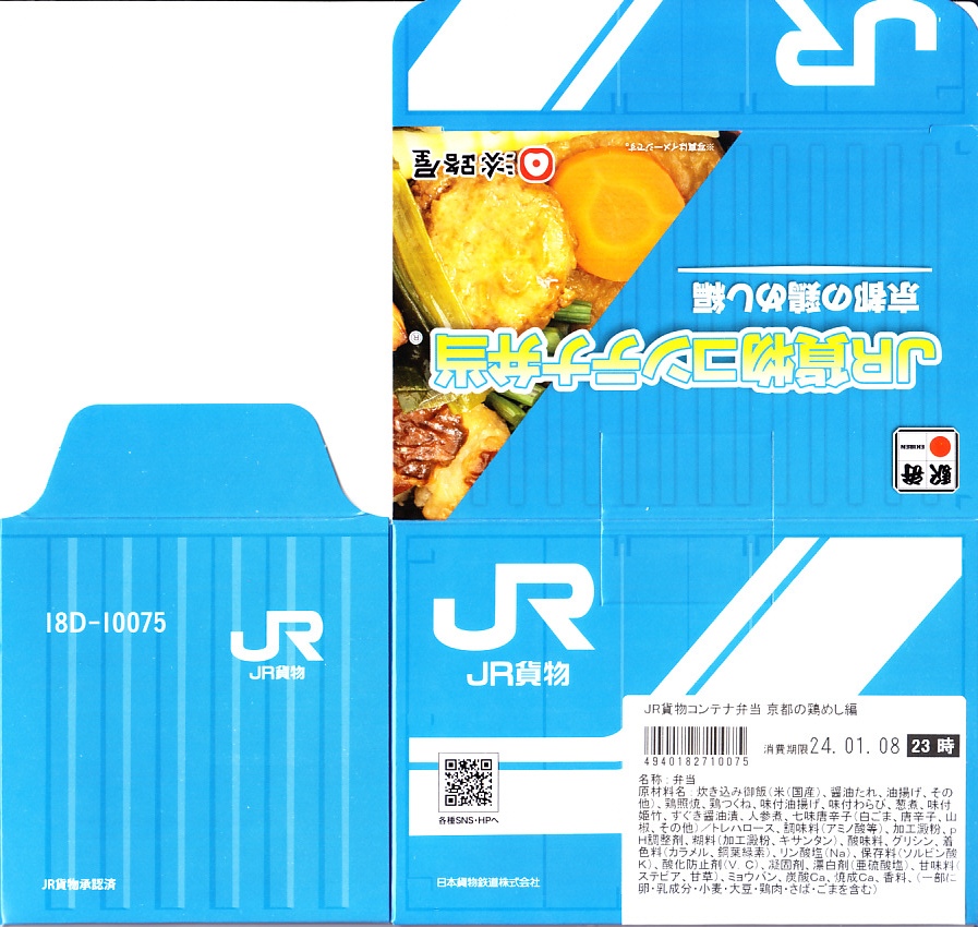2024(令和6)年1月6日に発売。前年1月に発売した下記「明石の鯛めし編」に続く、JR貨物コンテナ弁当の第3弾。今回は実在したタイプのJR貨物の鉄道貨物輸送向けコンテナ「18D−10075」の塗装を模したプラ容器を、同じ絵柄の紙箱にぴったり収める。形状は19Dを模した過去2作と同じで、天板が平面でなく波板であるなど、現実の実物と異なる感じ。