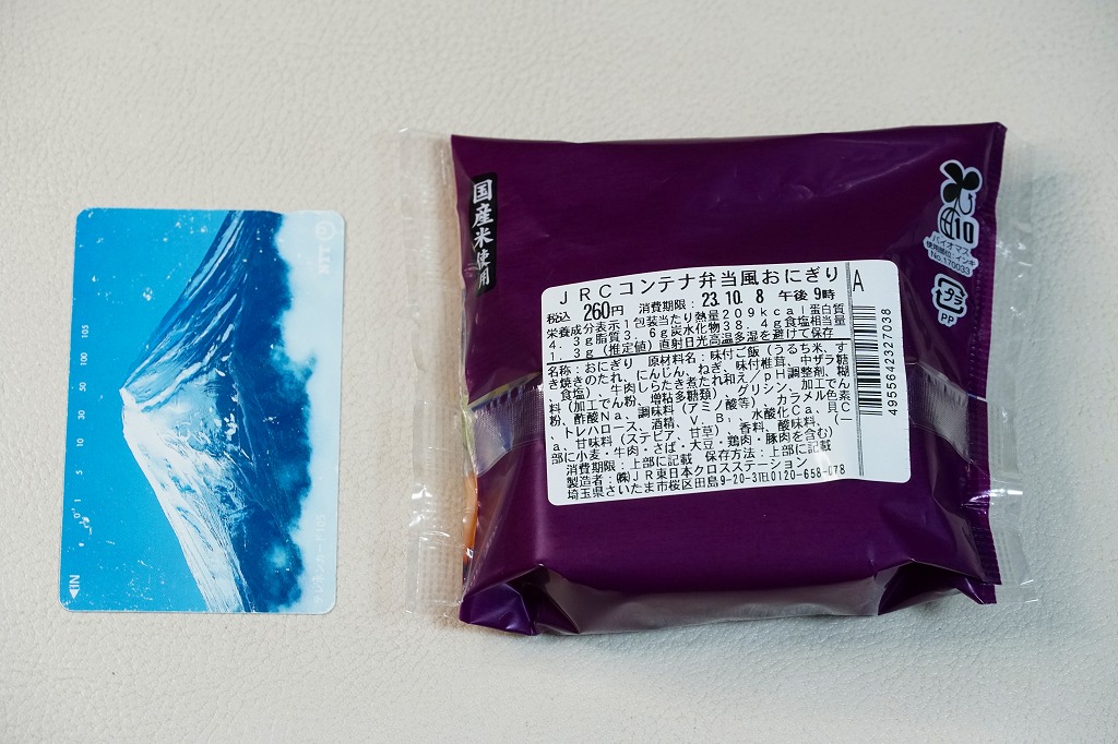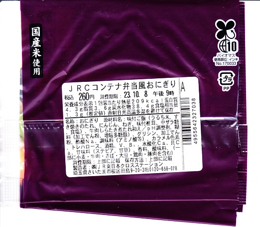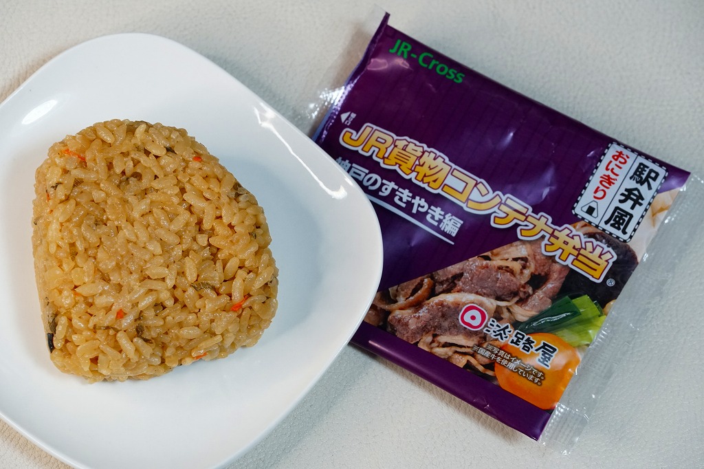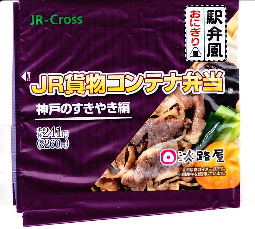 2023(令和5)年10月の発売か。上記の駅弁「JR貨物コンテナ弁当神戸のすきやき編」が、JR東日本の駅のコンビニ「ニューデイズ」で、コンビニおにぎりになったもの。食品表示ラベルでの商品名は「JRCコンテナ弁当風おにぎり」とある。駅弁のスリーブの絵柄が袋に、牛すきやき丼がおにぎりに、それぞえ反映されている。同年4月にJR東日本のコンビニ子会社と駅弁子会社が統合されたためか、このコンビニおにぎりが東京駅の駅弁売店で買えた。