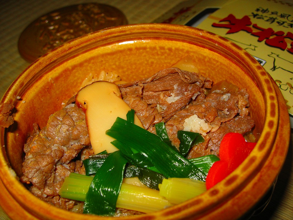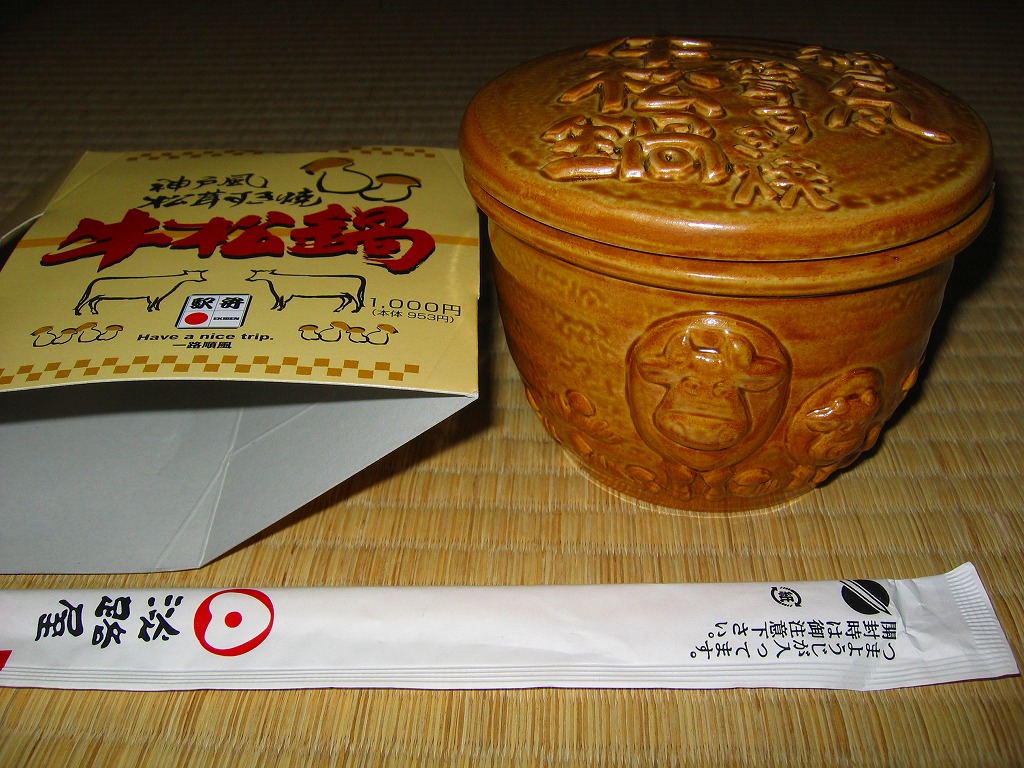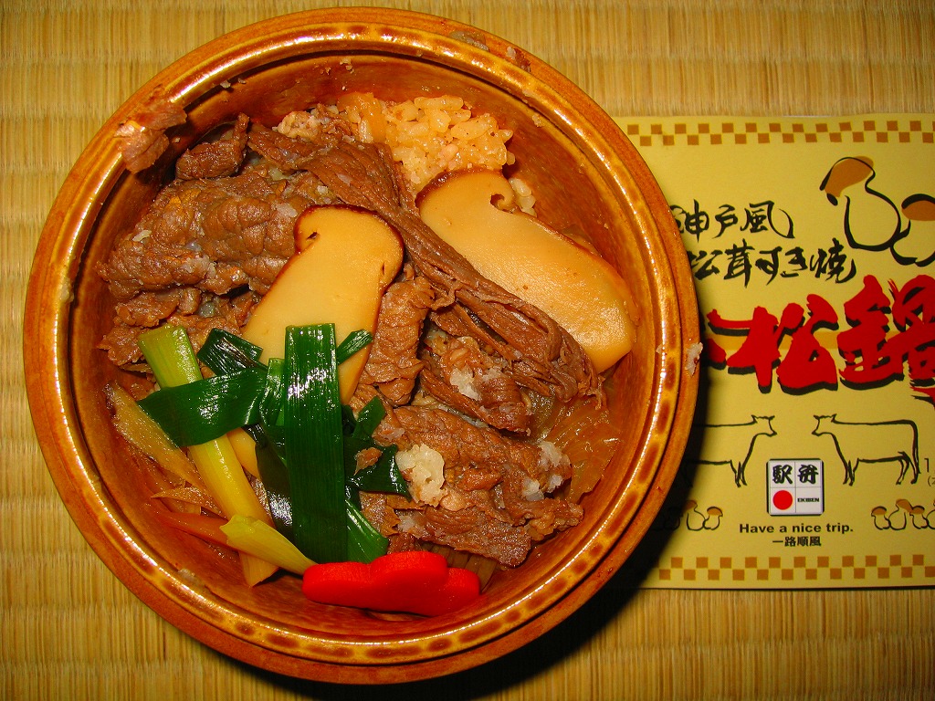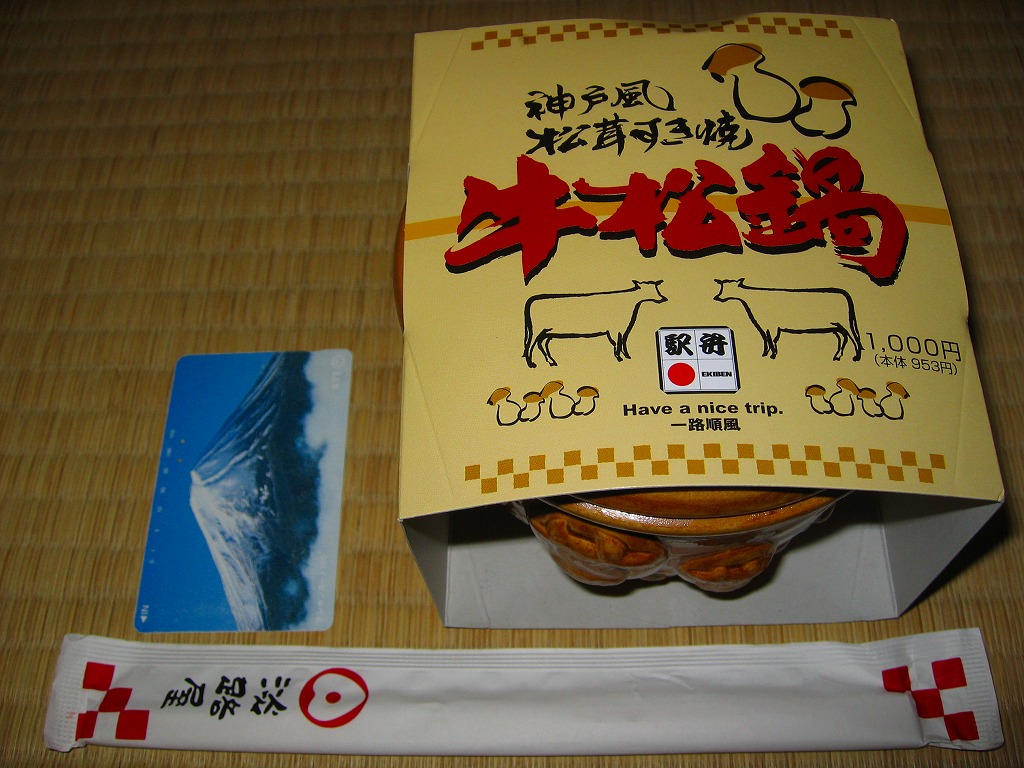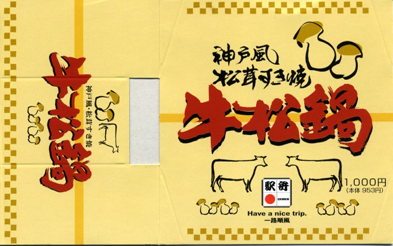 2006(平成18)年の秋に発売か。駅弁の名前と牛柄などが付く、小柄ながら厚みと重みがある専用の陶器を、また駅弁の名前を書いたボール紙の枠にはめる。中身は松茸入り御飯の上に薄切りの牛すき焼き肉と松茸が載り、人参、青ネギ、タマネギ、ゴボウ、糸こんにゃくを添えるもの。牛肉と松茸の鍋で、牛松鍋。