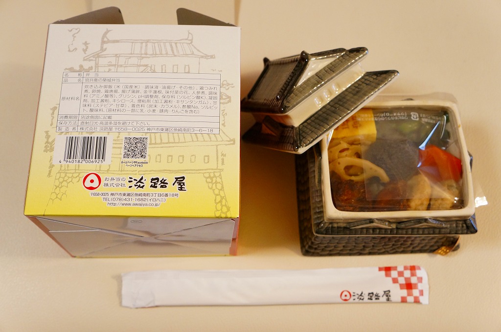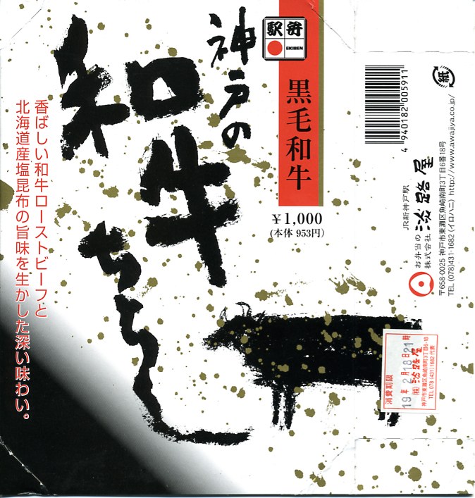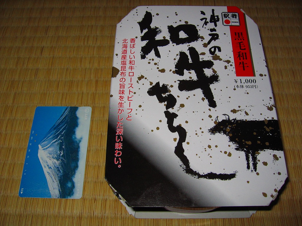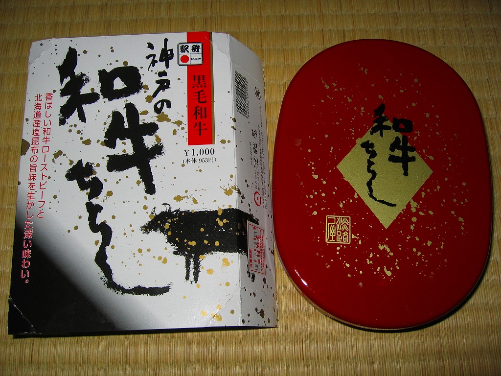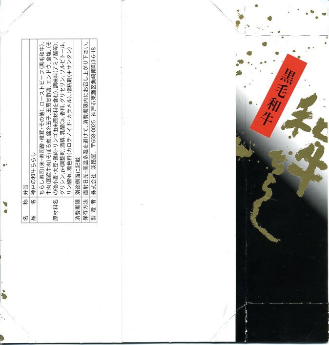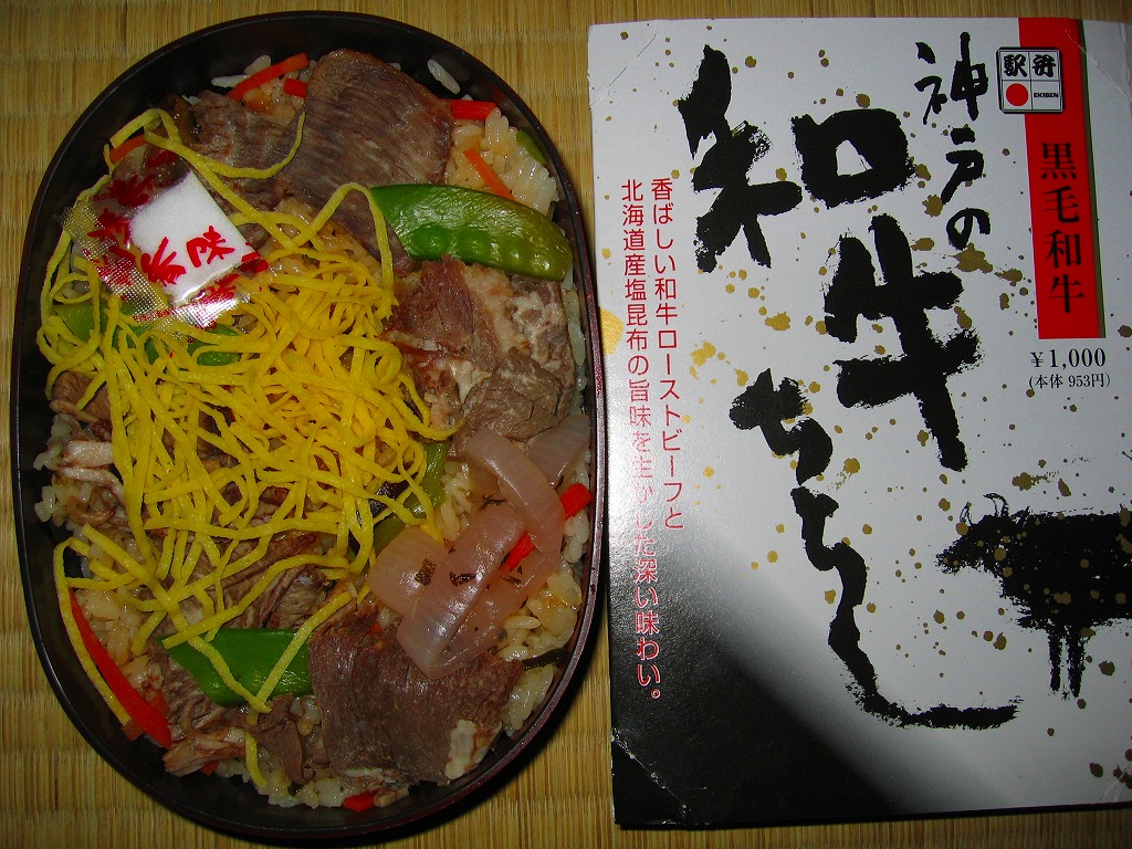 阪神大震災12周年と関係はなさそうだが、2007(平成19)年1月17日に発売。新潟で見たような小判型の赤黒いプラ容器と、それをはめるボール紙の枠の両方に駅弁の名前を書く。中身は五目ちらし寿司の御飯に、黒毛和牛のローストビーフを少々、野菜炒めと錦糸卵を混ぜて詰め、塩を袋で置く。味が好みかどうかは別にして、他に思い当たらないユニークな内容である。現在は販売されていない模様。