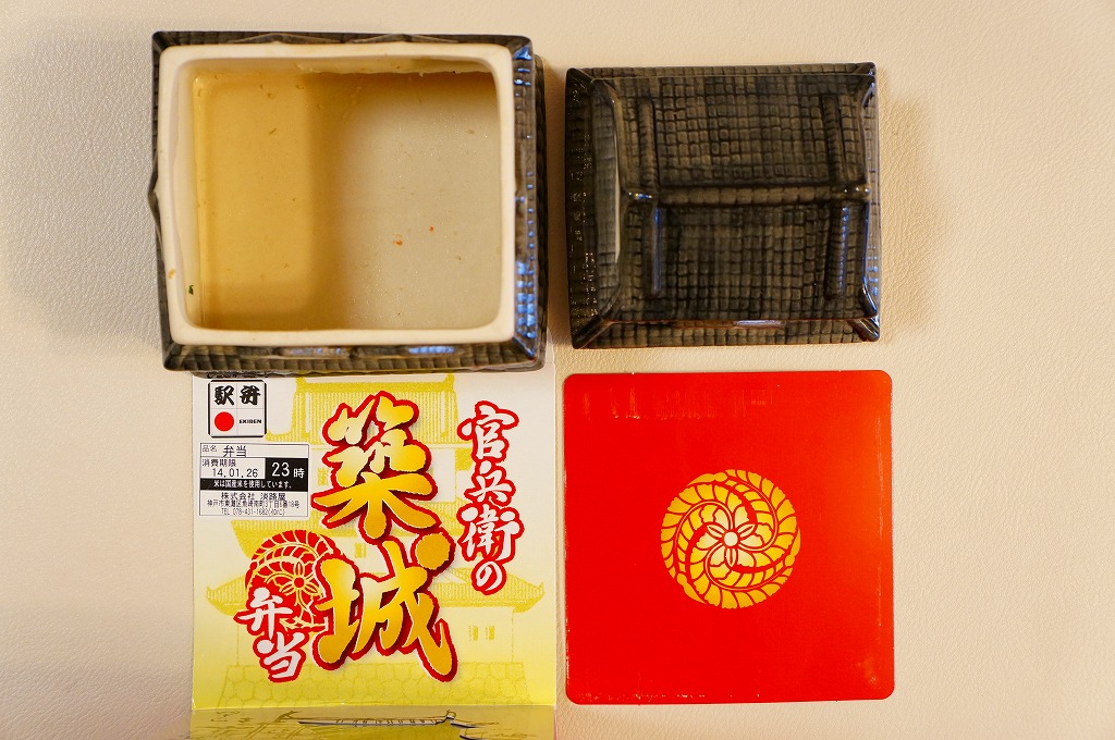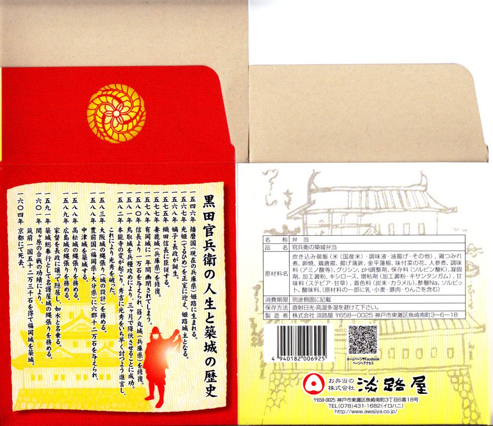 2014(平成26)年のNHK大河ドラマ「軍師官兵衛」にちなみ、2013(平成25)年12月27日に発売。姫路城の大天守を陶器で再現した容器は、10年前の姫路駅弁「一国一城」と同じ物ではないだろうか。この容器を収めるボール紙の箱で、官兵衛について細かく紹介。中身は炊込飯を鶏つみれ煮、「官兵衛」の焼き印入り玉子焼、鶏唐揚、揚げかまぼこ、きんぴらごぼう、菜の花、ニンジン煮で覆うもの。年末の大河ドラマの終わりを待たず、5月頃まで売られた模様。