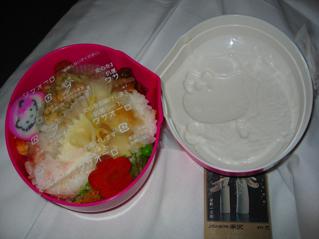 JR西日本のダイヤ改正に合わせて、2003(平成15)年10月1日に発売。宝塚歌劇団のスターに扮したキティちゃんを浮き出したプラスティック製容器を使用、中身は鮭とそぼろのおにぎりが1個ずつと、星形のコロッケに人参、キティちゃん柄の蒲鉾などが入り、見た目も中身もかわいらしい駅弁。発売当初で一日50個が販売された。2012年度限りで販売終了の模様。