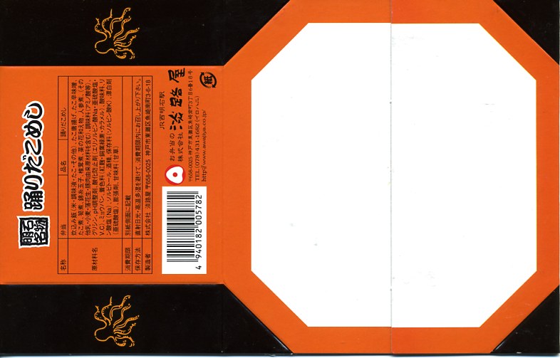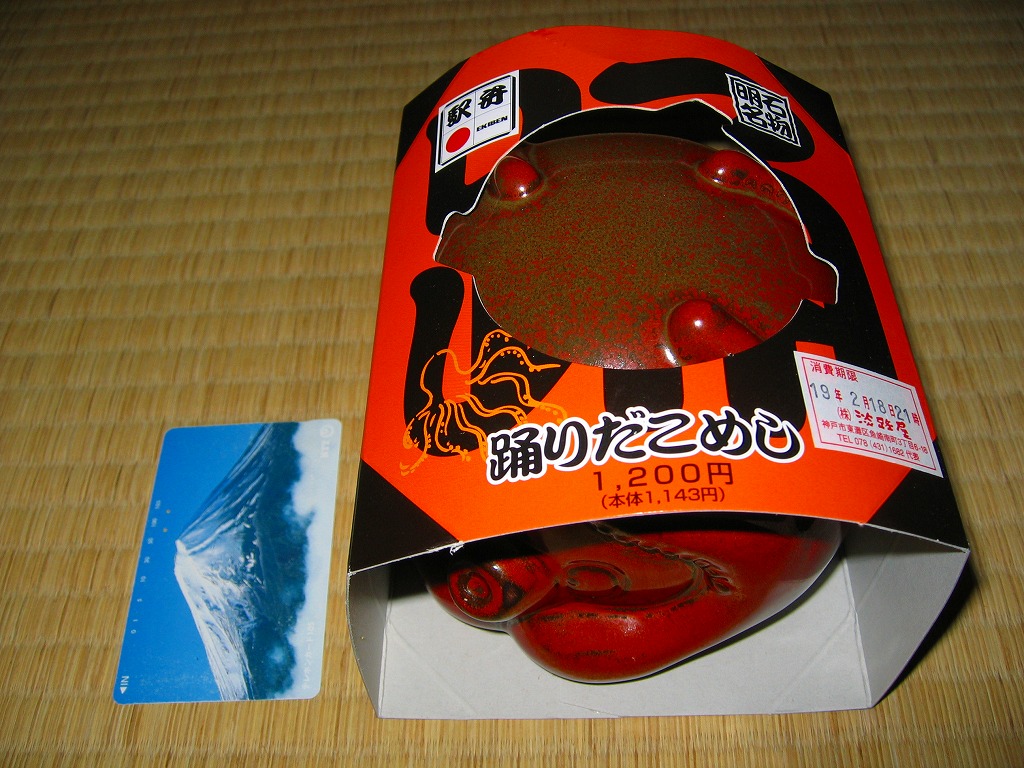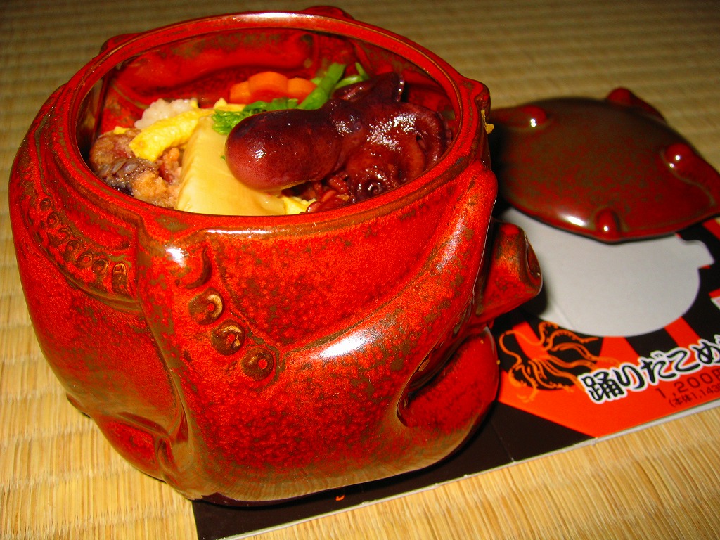 2007(平成19)年1月12日に発売か。商品名とマーク数点を書いたボール紙の枠から、新品にして年季が入ったような色合いの容器が見え隠れる。タコが頭(正確には胴体)を抱えた形状の陶器の中にはタコの炊込飯が詰まり、その上にタコ唐揚、タコ辛味噌、イイダコ旨煮と、タケノコや椎茸などの煮物と錦糸卵に菜の花が載る。容器は調味料入れへの流用を推奨し、塩・梅・砂糖のシールが付く。