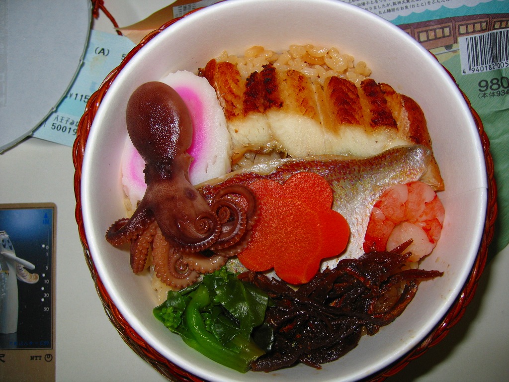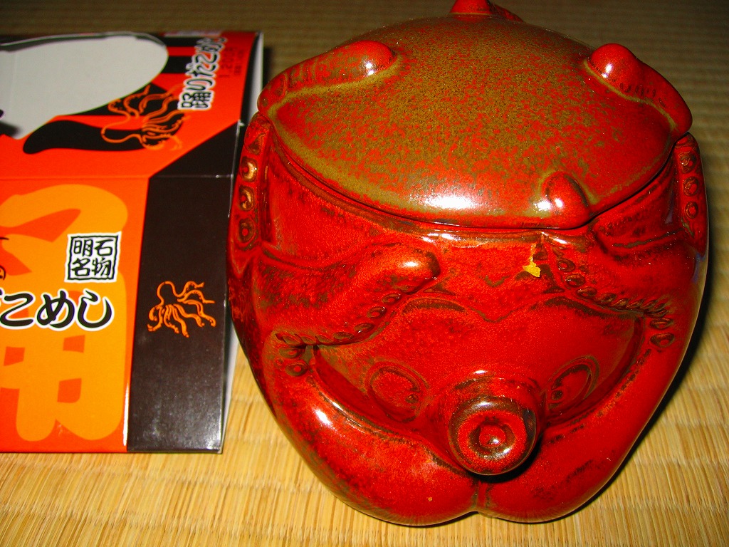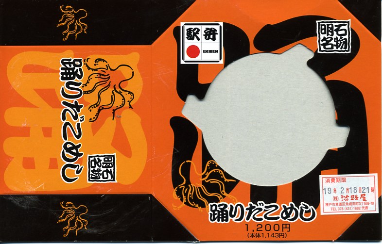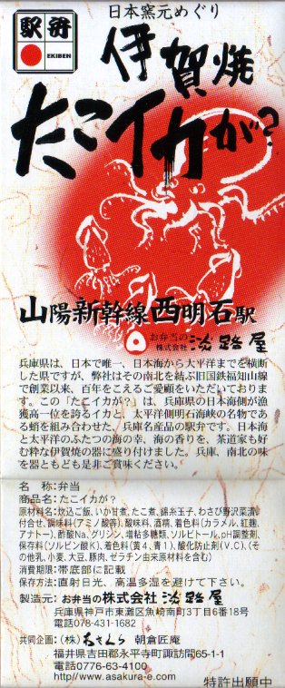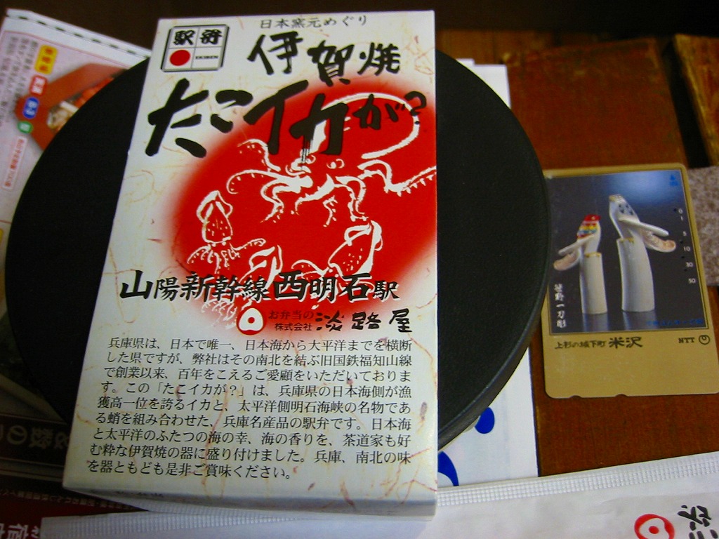 2002(平成14)年に発売。なぜか三重県伊賀焼の美しい容器を使用し、中身は刻みタコの炊込御飯に「たこ」の足と「イカ」甘煮「が」入っている。タコの香りがいっぱいで、イカはその存在感でタコに負けている。兵庫県は瀬戸内海と日本海に面しているため、本州を青森から下関まで陸路で移動すると必ず経由しなければならない県であるが、その太平洋側明石海峡のタコと日本海側のイカを使用したという。