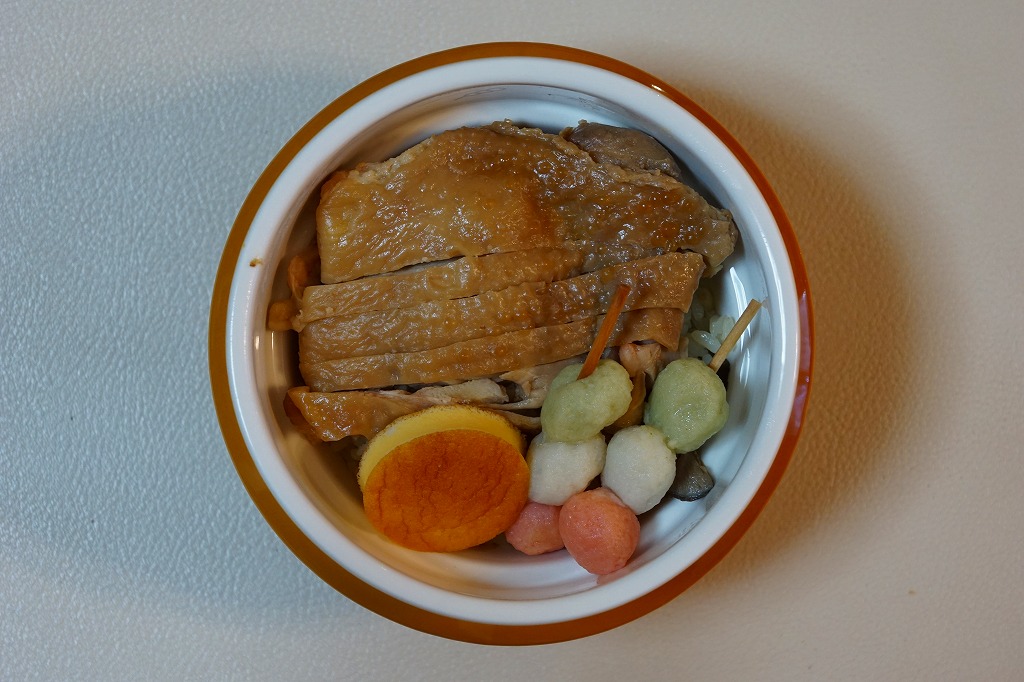 本体が陶製、ふたがプラ製の、駅弁にしても小柄な釜型容器に、きのこピラフを詰め、鶏うま煮で覆い、蒲鉾の三色団子2串とミニカステラを添える。コシのない食感と組合せのミスマッチでうまくないものの、容器や見た目で買われるキャラクター駅弁なので、これでよいのだろう。2019年までの販売か。2022年2月にオンラインショップで再販。