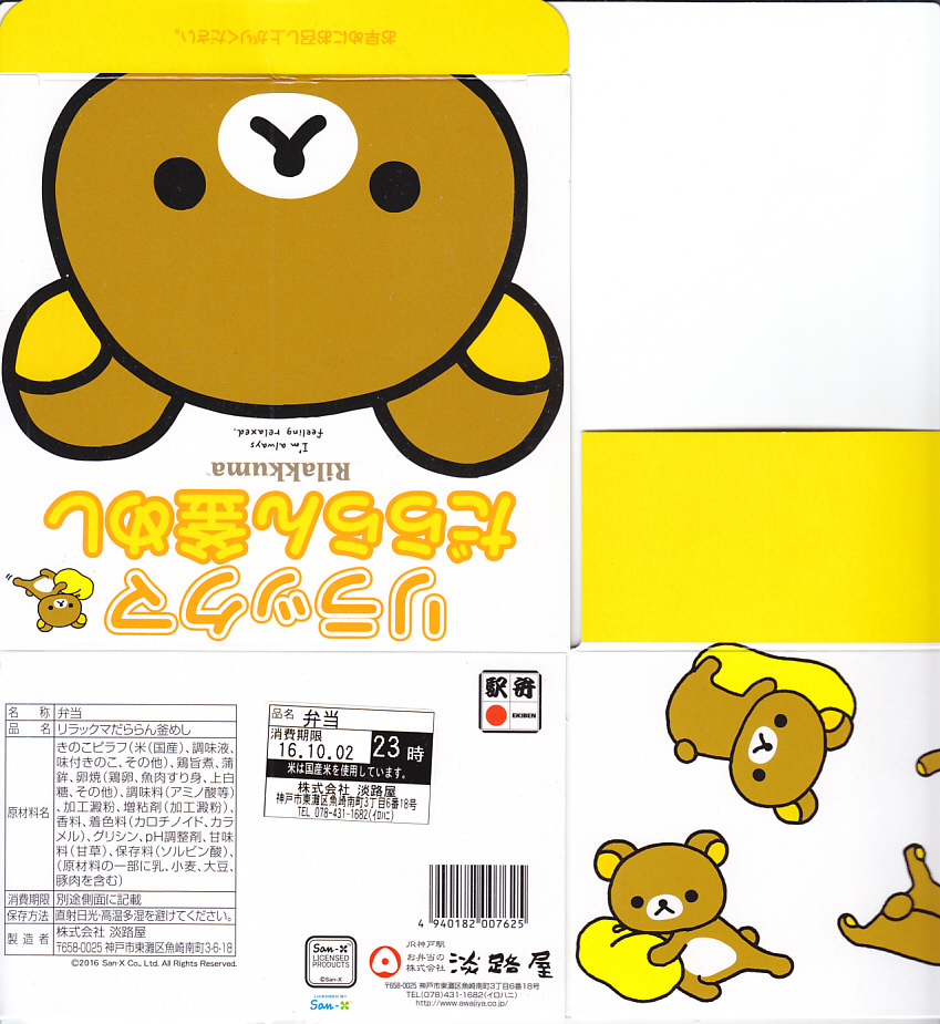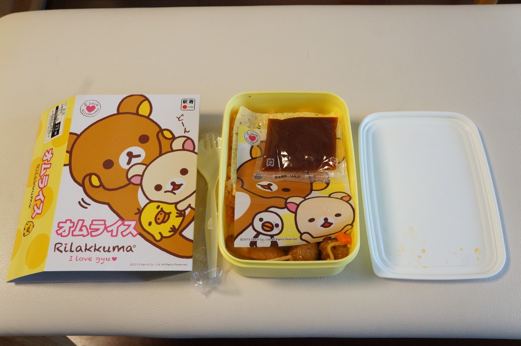 商品名は「リラックマオムライス」とも。2013(平成25)年10月26日に、調製元のプレスリリースによると「全国初、リラックマ駅弁」として発売。ただ、狭義の駅弁ではないとはいえ、東京都内で5年前に「リラックマのお手作りバーガー」が出ている。