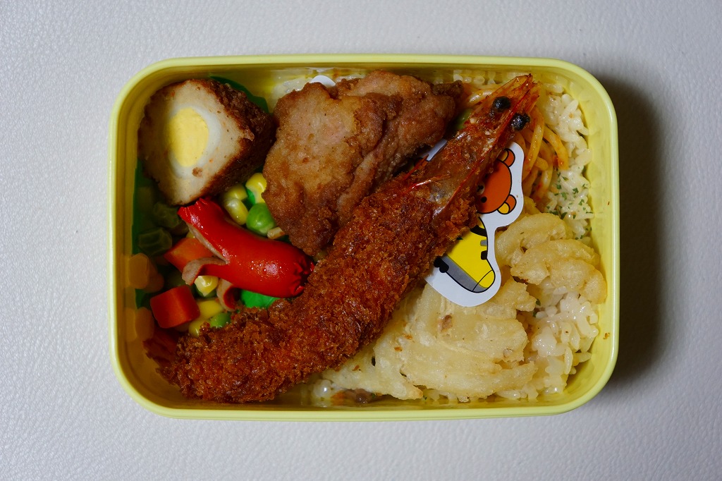 弁当箱の中身は、きのこピラフをえびフライ、スパゲティ、鶏唐揚、スコッチエッグ、妙な形のポテトフライ、ウインナー、ミックスベジタブルで覆うもの。引き続き新神戸駅弁のお子様ランチは、他駅の冷凍食品の塊でなく、洋食の香りと味がする。弁当箱も引き続き、活用が可能。2017(平成29)年の春頃までの販売か。