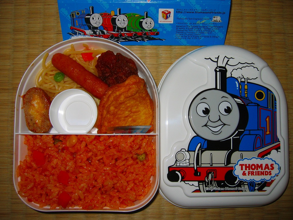 2008(平成20)年の秋に登場した、おそらく世界初のきかんしゃトーマス駅弁。その主人公であるトーマスのイラストを採用したプラスティック製の容器を、同じ絵柄のボール紙の枠にはめるのだが、顔の部分がパッケージから文字通り顔を出している。中身はチキンライスに鶏唐揚、オムレツ、スパゲティ、ウインナー、肉団子。容器も中身も楽しいお子様ランチ。