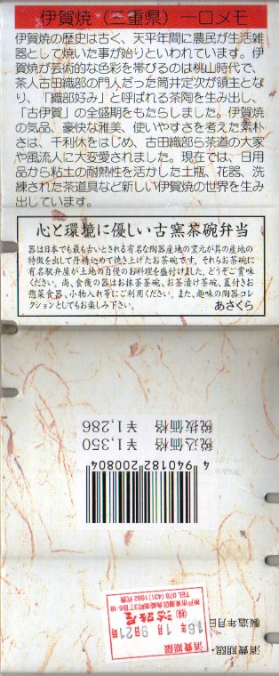 福井の業者が「日本窯元めぐり」として2001年に加賀温泉・名古屋・豊橋・草津・岡山・和田山の各駅の駅弁業者に声を掛け、同じ大きさの容器と同じ値段で6種の駅弁をプロデュース、駅弁大会に売り込んだのだろう。2002年にたしか3種の新種が出た。現地で入手できるかは不明。