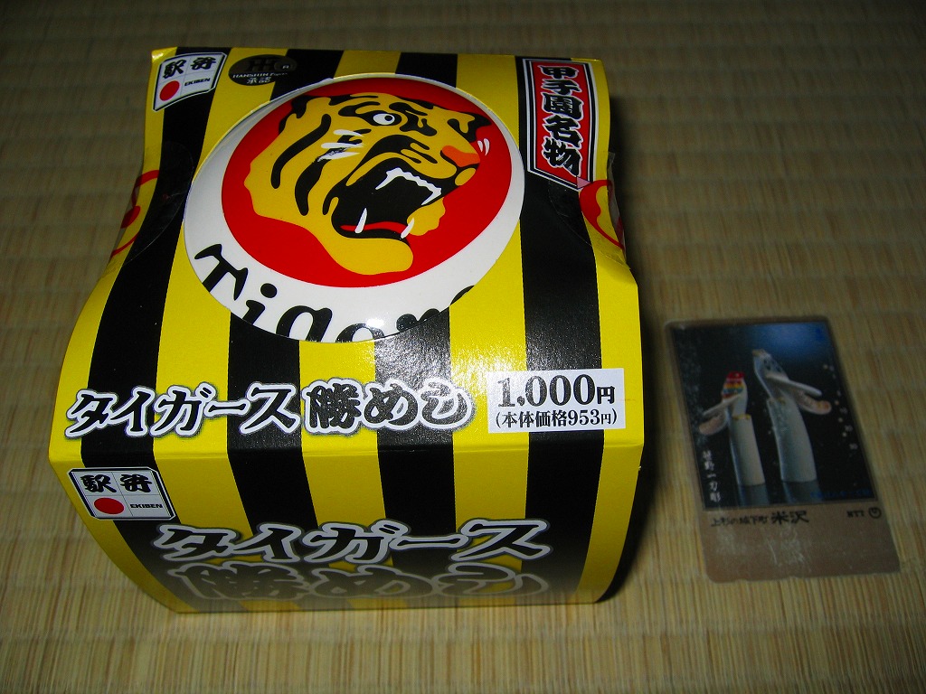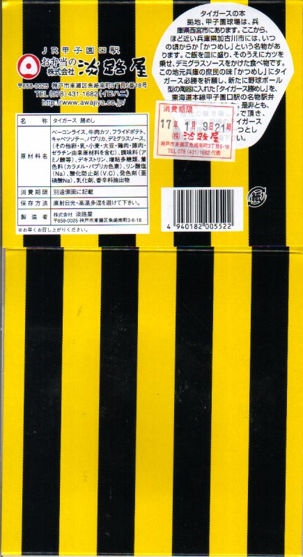 2004(平成16)年の春頃に発売か。プロ野球阪神タイガースのロゴマークをプリントした、野球ボール型の陶製容器を、タイガースらしい黄色と黒の縦縞なパッケージにはめてシールで留める。中身は甲子園球場に近い兵庫県加古川名物「かつめし」だそうで、コンソメ御飯に牛カツが3切れほど載っており、添付のデミグラスソースを付けて食べる。味は濃厚さと軽さが同居したような感じ。甲子園で阪神戦がある日にはJR甲子園口駅でも販売され、駅弁大会では大人気ですぐ売り切れる。価格は購入時で1,000円、2014年4月の消費税率改定で1,030円。2011(平成23)年以降に売られたかどうか不明。