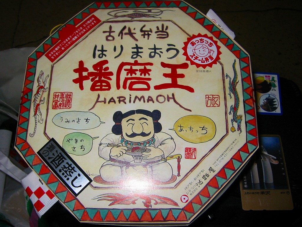 神戸の駅弁が誇る「あっちっち」シリーズの加熱機能付き容器を使用、ヒサクニヒコ氏による箱のイラストは、播磨王家の山幸姫に海幸彦や古代中国の四神を描いたという。