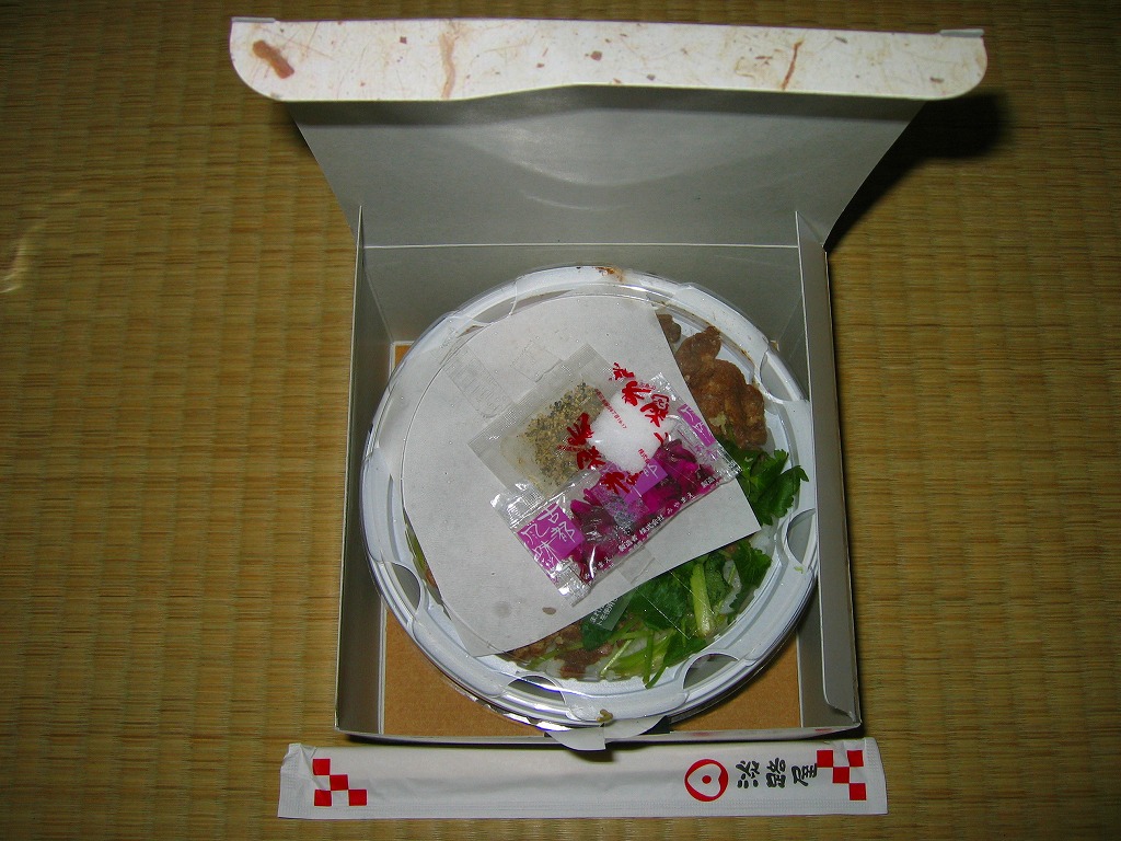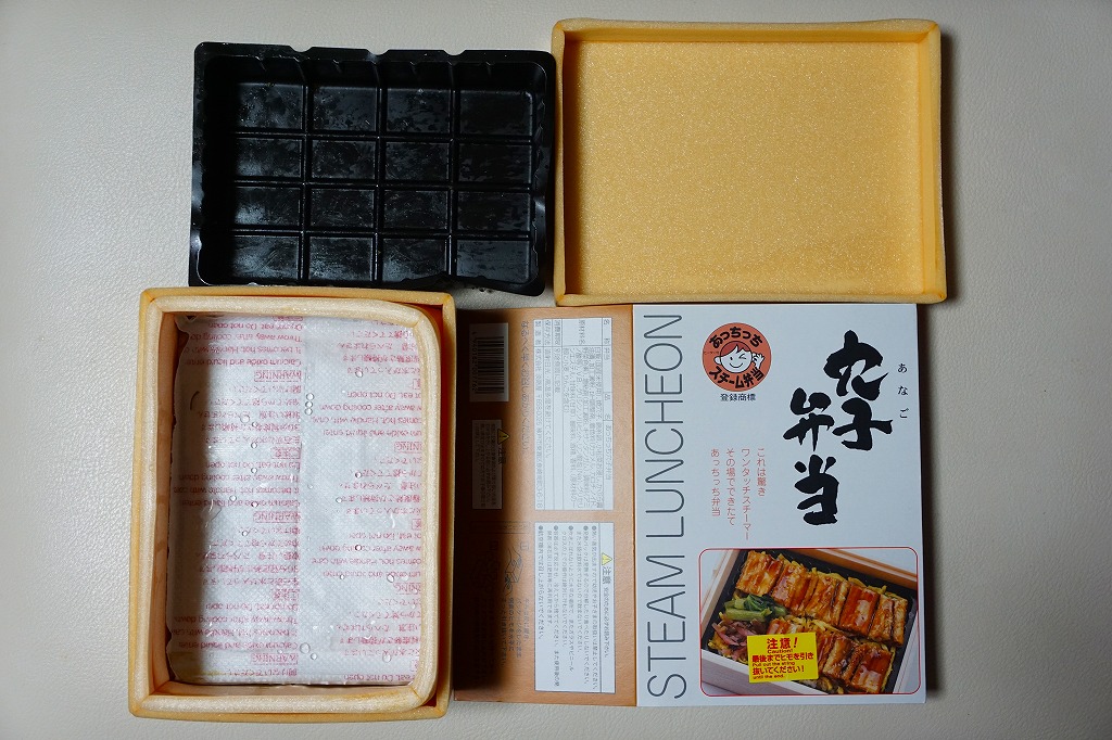 3区画の中身は、白飯、蒸し鶏に煮ダコに焼アナゴにタイなどのおかず、もみじおろしとポン酢。当初の塩蒸しから酒蒸しに替えたという具に味付けがなく、そのまま食べれば駅弁らしくない薄味が温かく楽しめ、なかなかうまい。加熱式駅弁で具だくさんというのも珍しい。2007年頃までの販売か。