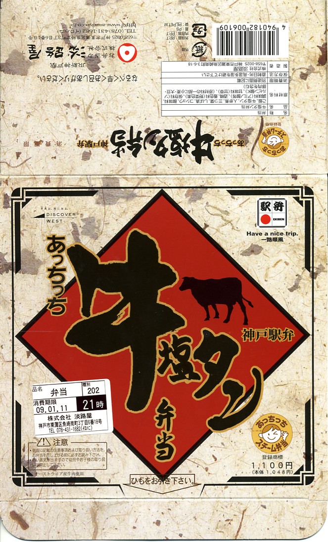 2007(平成19)年に発売か。円形の加熱機能付き容器を、駅弁の名前をデザインしたボール紙の箱に詰める。中身は白御飯の上に5〜6枚の牛塩タンを貼り付けて、ミツバとニンジンを添えたもの。塩とコショウと柴漬けを別添とした心遣いは、さすがの神戸駅弁。風味にも加熱式駅弁や牛肉駅弁に長ける調製元の実力が感じられる。食後感も良好、宣伝臭はほとんどなし。現在は販売されていない模様。