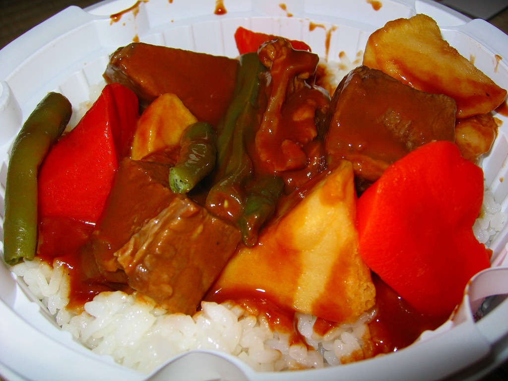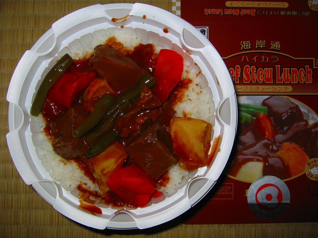 2006(平成18)年に発売。円形の加熱機能付き容器を、中身の写真を載せるビーフシチュー色の紙箱に詰める。中身は白御飯の上に大きな牛肉やジャガイモやニンジンやこんにゃくやインゲンの角切りを散らし、デミグラスソースをかけるもの。