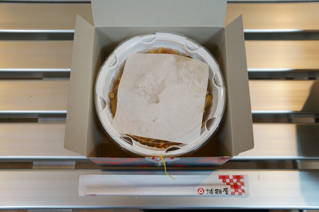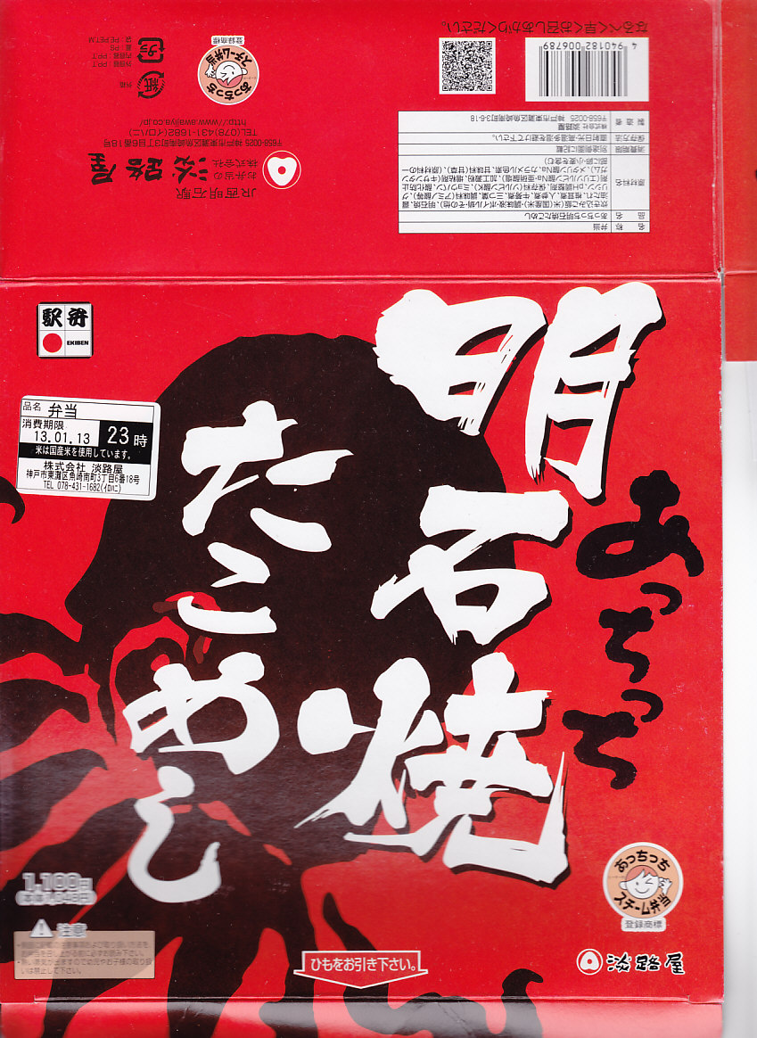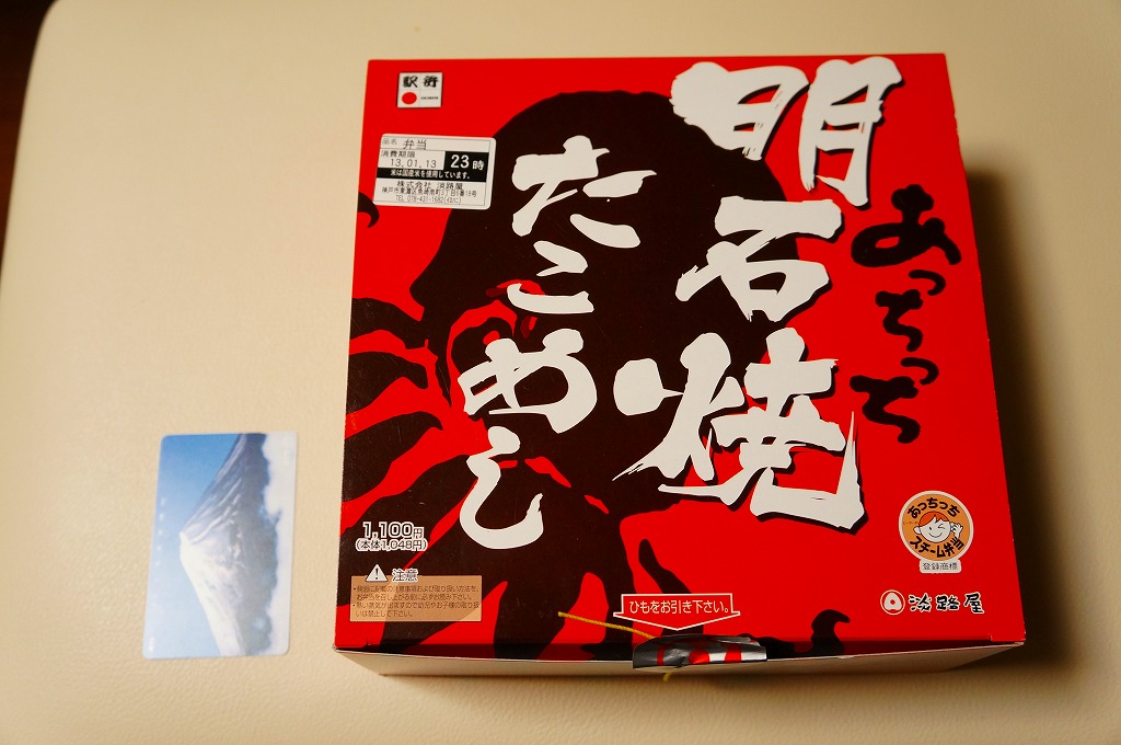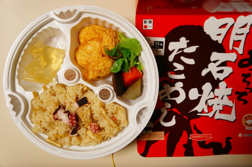2012(平成24)年9月8日の発売。円形の加熱機能付き容器に、タコ飯、根菜の煮物と明石焼、出汁を詰める。ここの看板駅弁のひとつ「ひっぱりだこ飯」より軽い感じの柔らかいタコ飯も、過去に明石の市街で食べたものとほぼ同じ風味の明石焼も、心地良い感じ。価格は2013年の購入時で1,100円、2014年時点で1,080円。2014年までの販売か。