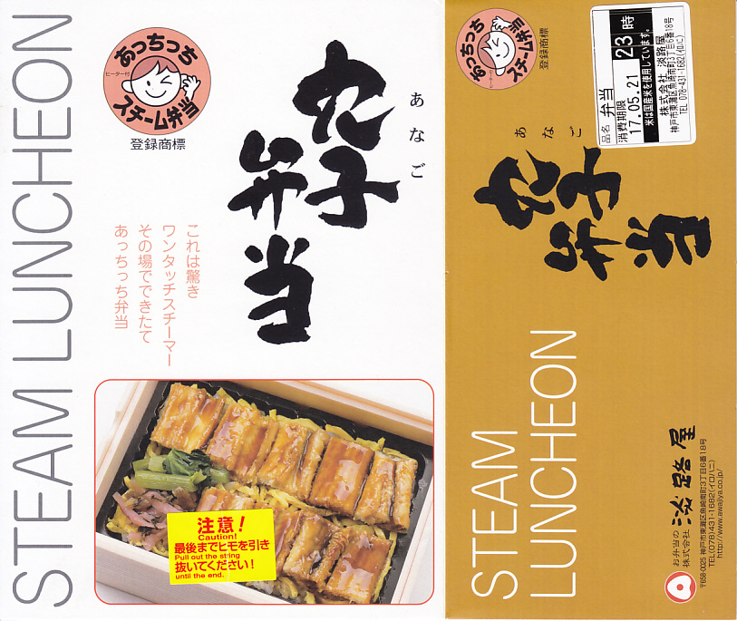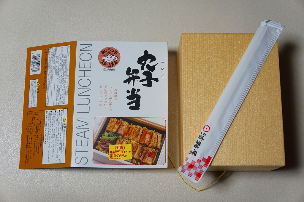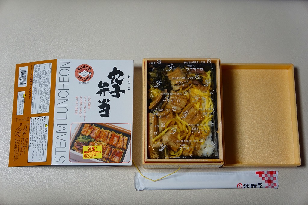 四角い加熱機能付き容器に白飯を詰め、焼きアナゴ、錦糸卵、小松菜のおひたし、かぶら醤油漬で覆う。今回購入のものは600kmの旅の結果か具が散らされているが、調製元の公式サイトの写真ではアナゴが整然と並べられている。神戸から本州各地に広まった加熱機能付き容器は、ここでは隙間なくコンパクトになっていた。2か月間ほどの販売か。