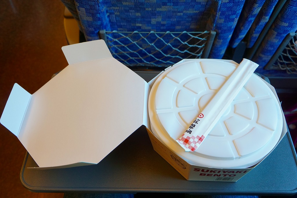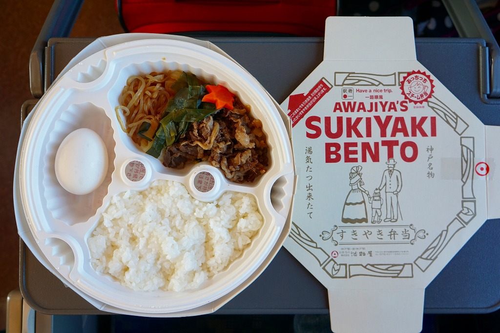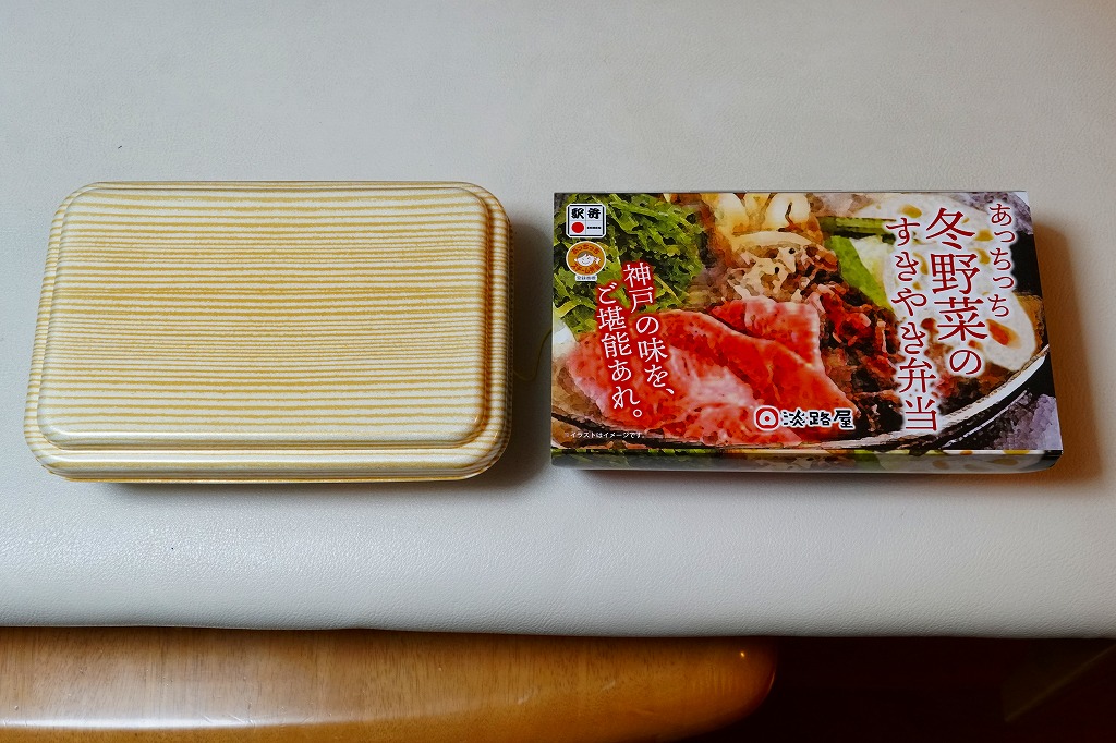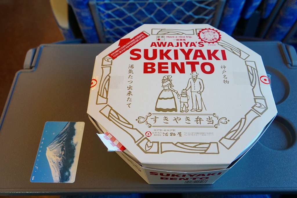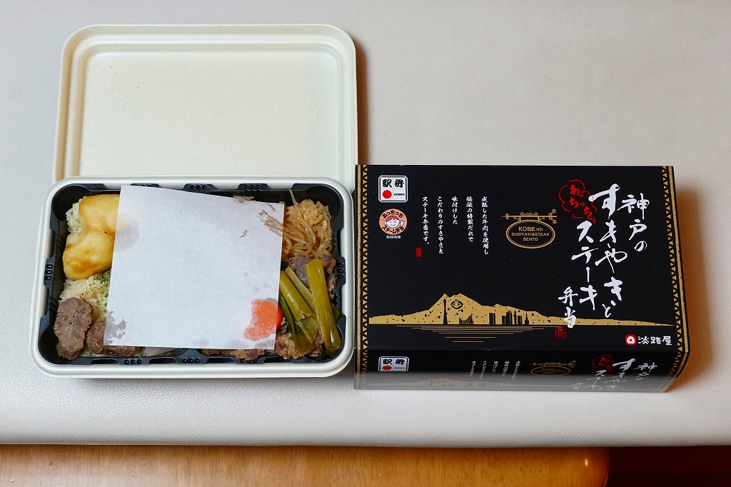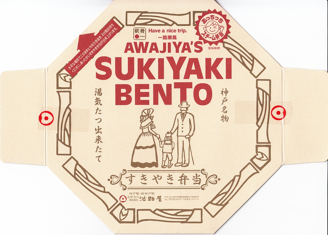 駅弁の名前は「あっちっちすきやき御飯」とも。パッケージの記述から、「のぞみ」新神戸駅停車を記念して2001(平成13)年10月に発売か。神戸の他の加熱機能付き容器駅弁でお馴染みの、八角形のパッケージに円形の容器を入れる。中身はわりしたで炊いた御飯の上に、兵庫県産和牛を使用したという牛すき焼きを載せるもの。つまり高級な牛丼ということで、温めればモリモリと食べられる。