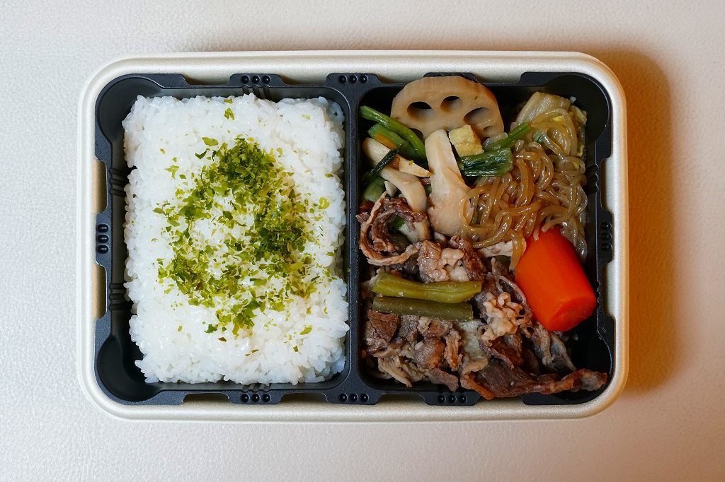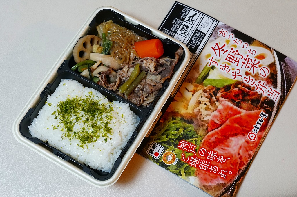 2019(令和元)年12月までに発売か。長方形の加熱機能付き容器の、半分に海苔をかけた御飯を、半分に牛肉や糸こんにゃくやエリンギや白菜やレンコンやニンジンなどのすき焼きを詰める。飯の量が多いため熱が足りないことと、肉が硬いことは仕様かどうか。2月か3月の頃には「春」に切り替わった。2021年春前に終売か。