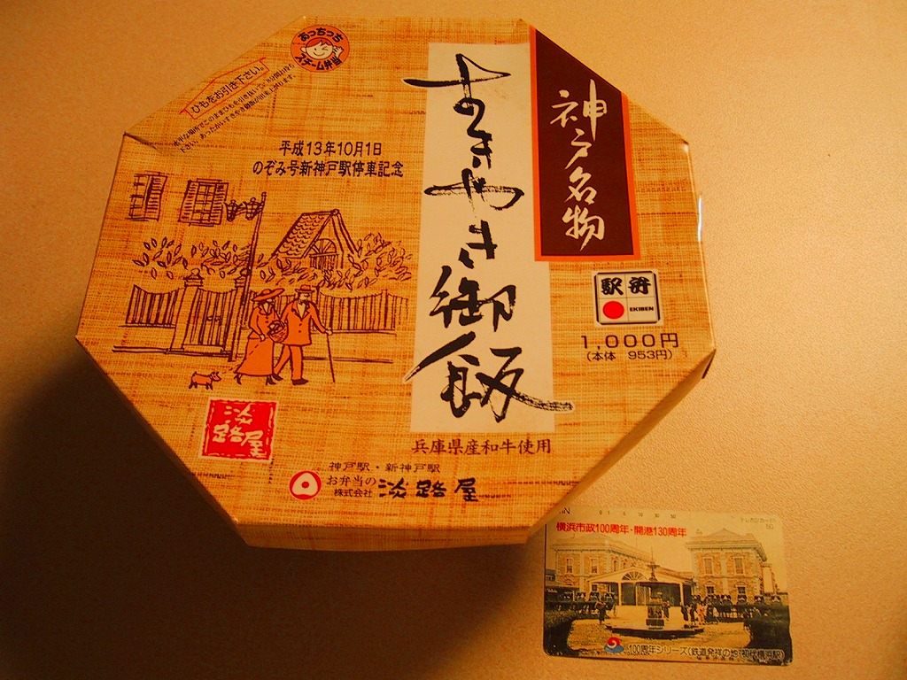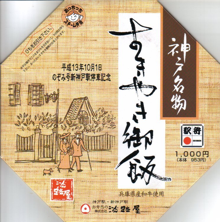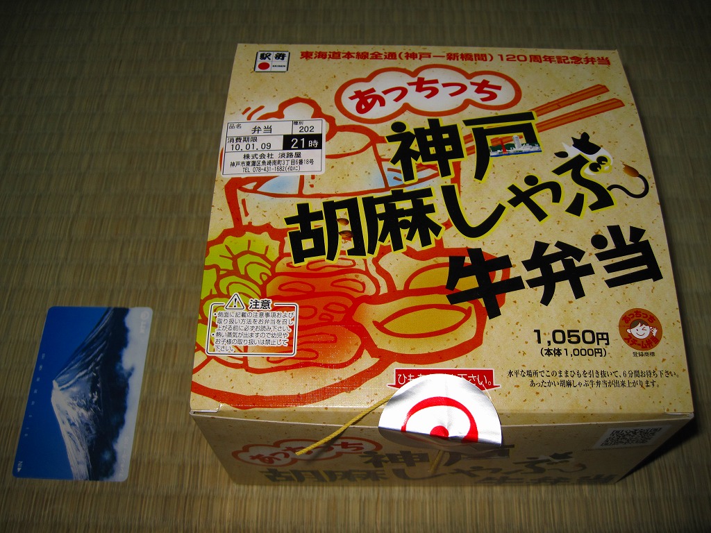 2010(平成22)年1月の京王百貨店の駅弁大会に向けた投入か。東海道本線全通(新橋−神戸間)120周年記念弁当の副題が付いている。円形の加熱機能付き容器を使用、駅弁の名前とそのイメージイラストを描いたボール紙の箱に詰める。中身は白御飯の上をタマネギと青ネギとニンジンの炒め物で覆い、牛肉煮を少々つまむもの。しゃぶしゃぶというより時雨煮のようになった牛肉の風味が、なんとなく残念。神戸で昭和の頃から定評のある常温版のしゃぶしゃぶ駅弁の面影は、こちらにはなかった。現在は販売されていない模様。