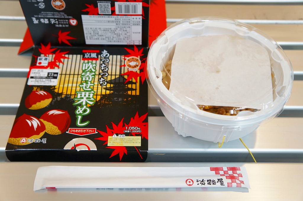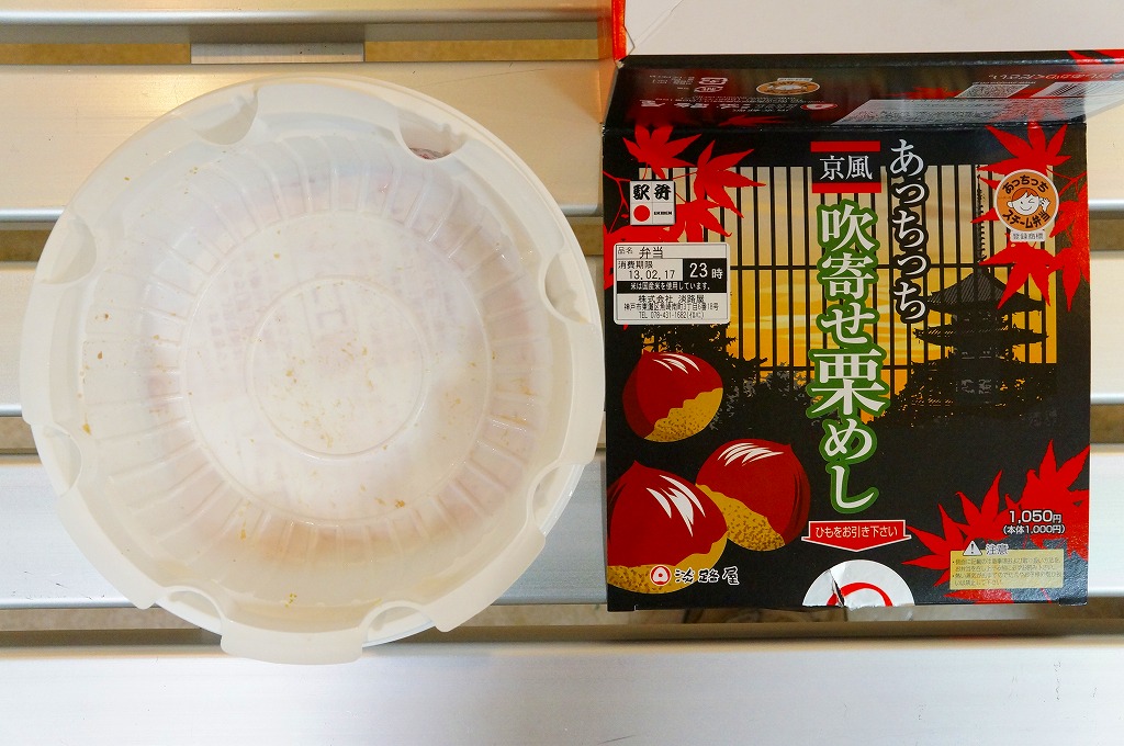 2012(平成24)年9月4日の発売。円形の加熱機能付き容器に山菜ご飯を詰め、クリ、サツマイモ、カボチャ、クルミ、アイガモ、マツタケなどを散らすもの。栗飯を名乗るも飯に栗はなく、クリの甘い欠片は確かに複数個だがクルミの分量と存在感が大きく、2切れのカモ串とマツタケにも存在感があり、しかしカモ駅弁やマツタケ駅弁というほどでもない、という秋の味。調製元の公式サイトでも秋季限定と書かれている。価格は購入時で1,050円、2014年4月の消費税率改定で1,080円。2014年までの3シーズンの販売か。