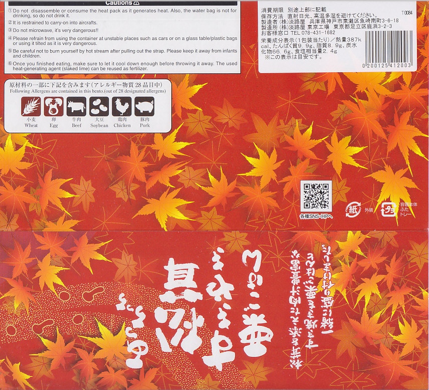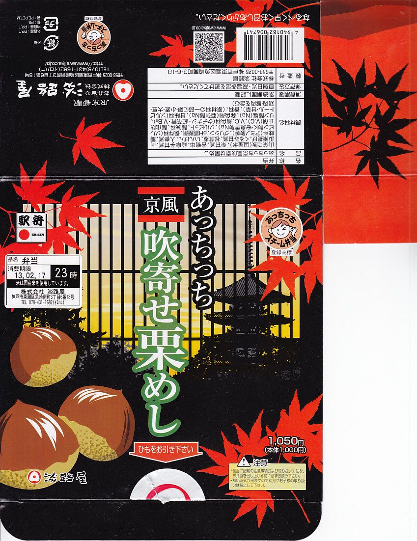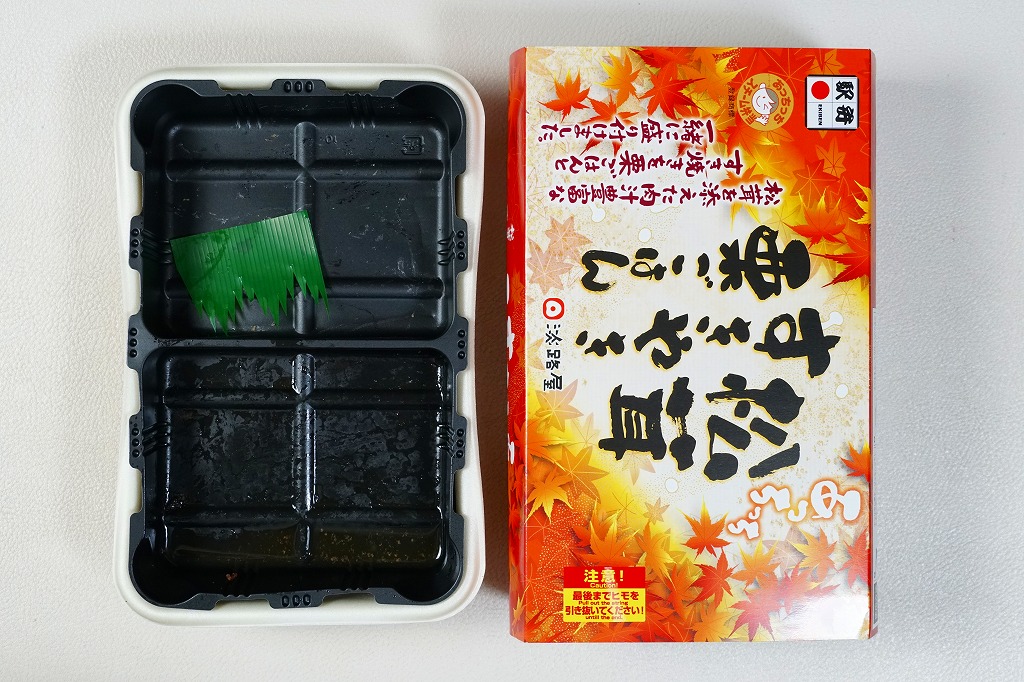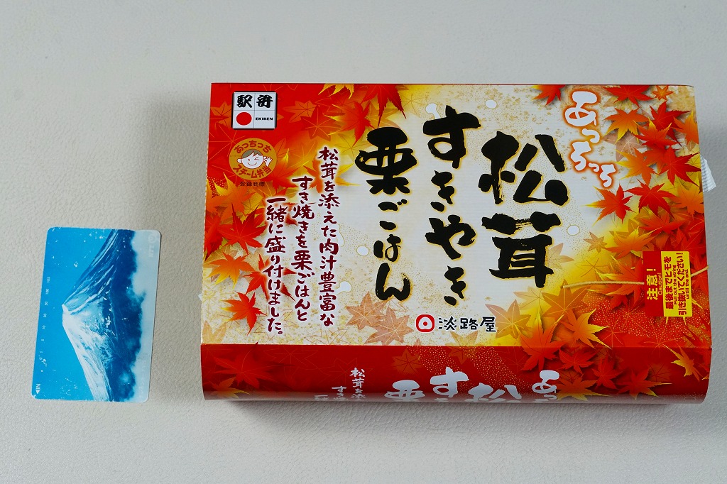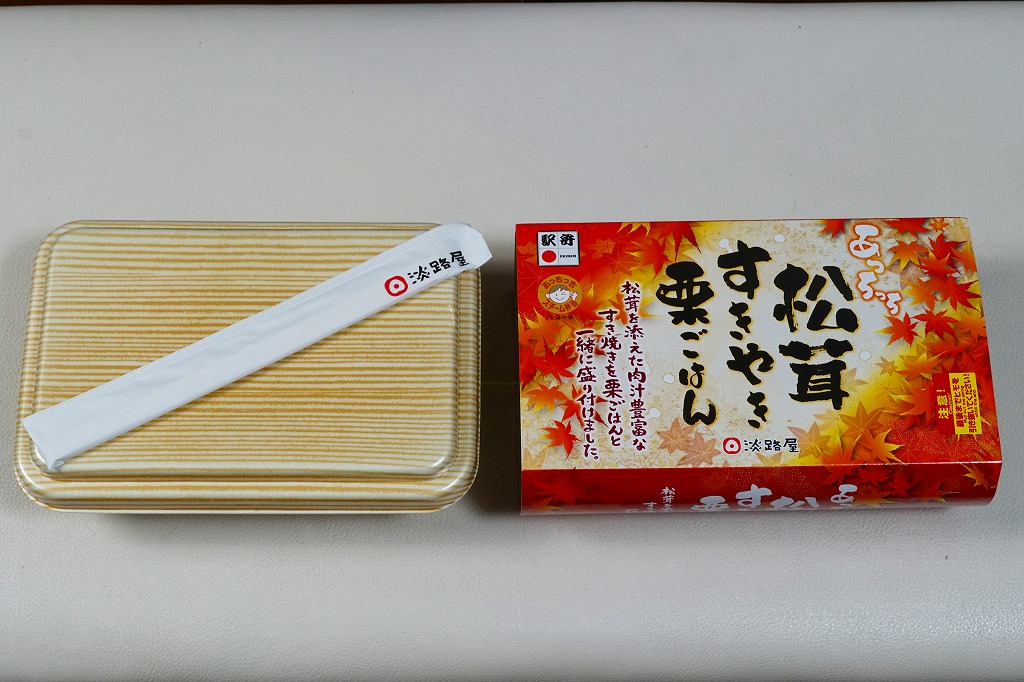 2018(平成30)年の9月に初めて販売か。秋季限定、もしかすると主に駅弁催事や通信販売で売られる商品かもしれない。四角い加熱機能付き容器の、2区画の両方に味付き飯を詰め、一方を牛肉や糸こんにゃくや厚揚げやマツタケなどで覆う「すきやき」、他方を栗やひらたけやニンジンなどで覆う「栗ごはん」とした。調製元が得意な容器と内容を備える、安定の味。紅葉が美しいスリーブが、売り場に秋をもたらす。価格は2021年時点で1,250円、2022年時点で1,420円、2025年時点で1,480円。