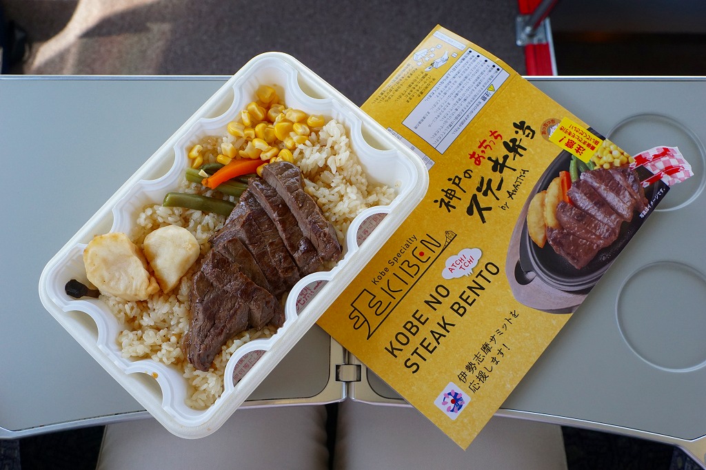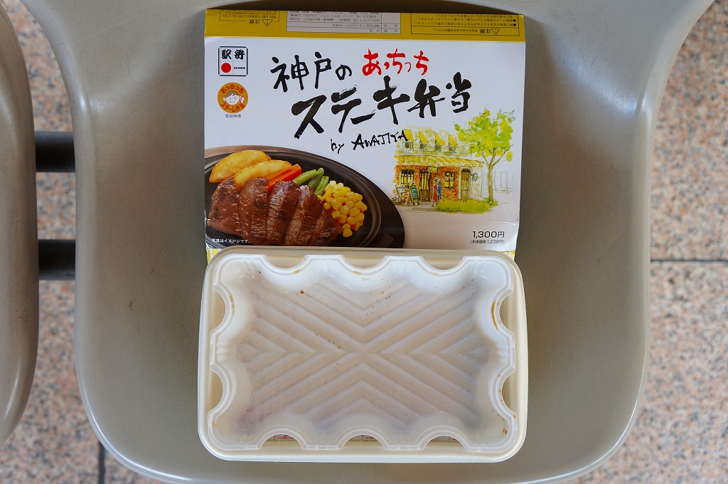 2012(平成24)年8月に発売か。神戸の駅弁で「あっちっち」と「ステーキ弁当」との組合せが今までなかったことは盲点だった。ボール紙のパッケージは「あっちっち」でない神戸のステーキ弁当と同じ意匠。長方形の加熱機能付き容器にきのこピラフを敷き、牛肉ステーキを載せ、コーン、ポテトフライ、いんげん、ニンジン煮を添えるもの。赤身だけで歯応えと柔らかさと香りと風味を出すステーキ肉は、170種類もの駅弁を集めたというこの駅弁売店にもライバルはいない味。価格は2012年の発売時や購入時で1,300円、2014年4月の消費税率改定で1,330円、2016年時点で1,350円、2022年3月から1,380円、2023年時点で1,420円、2024年時点で1,580円。