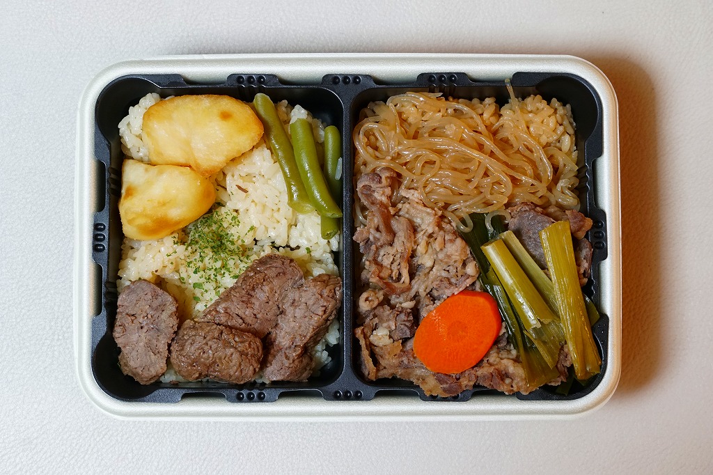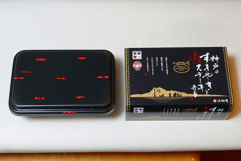2019(令和元)年の発売か。2015(平成27)年発売の「神戸のすきやきとステーキ弁当」の、加熱機能付き容器バージョンであり、スリーブは同じ絵柄をしている。中身は常温版と少し異なり、きのこピラフと牛ステーキとポテトフライとインゲン、味付き飯と牛肉煮とネギやニンジンの煮物と糸こんにゃくという、2種類の牛肉丼というつくり。価格は2019年時点で1,380円、2023年時点で1,420円、2024年時点で1,580円。