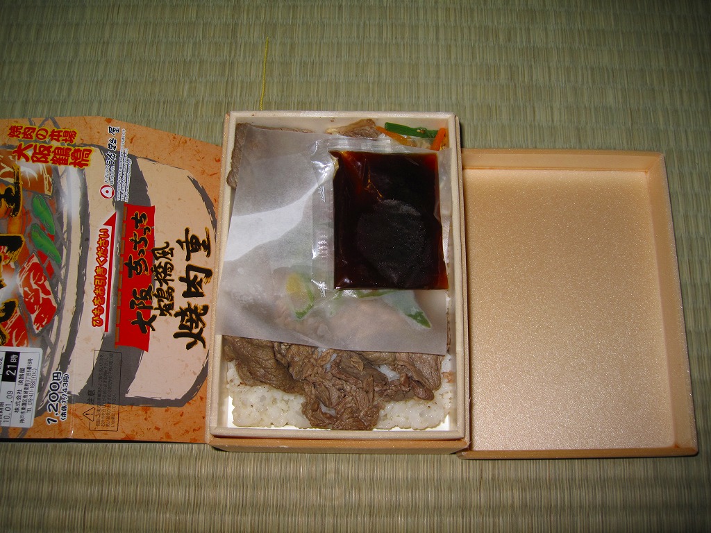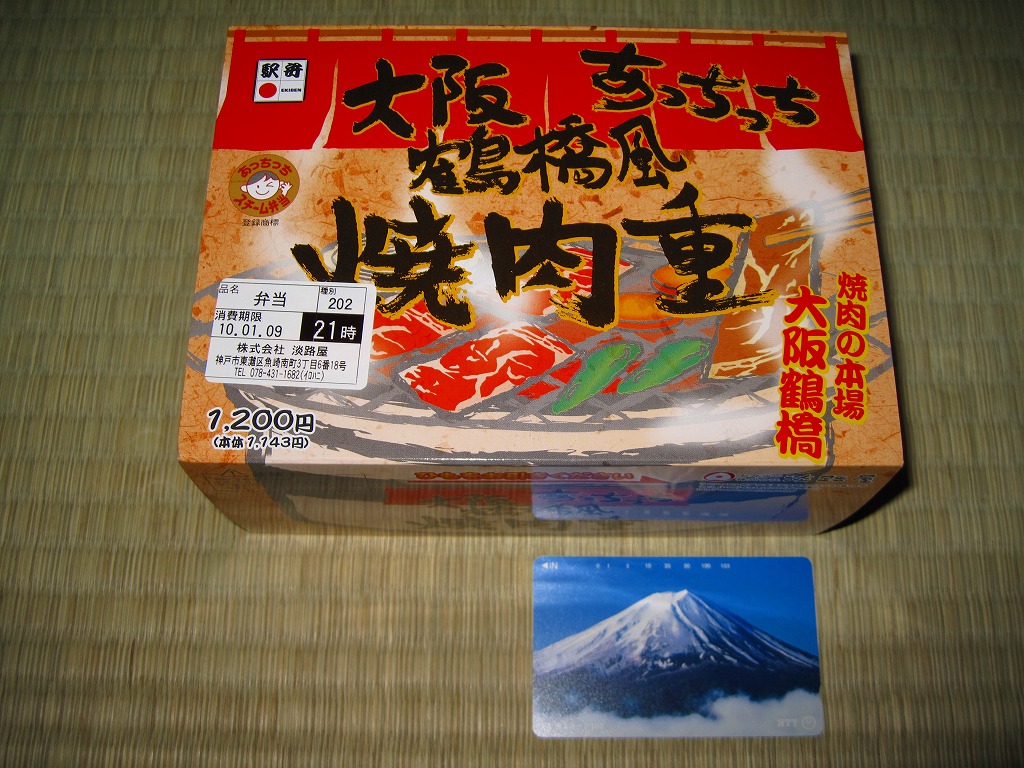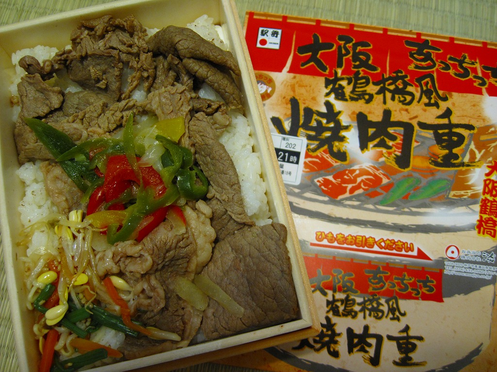 2009(平成21)年8月3日に発売か。東海道本線全通(神戸−新橋間)120周年記念弁当の副題が付いている。加熱機能付き容器の駅弁ではあまり見ない、長方形の容器に加熱機能をぴったり埋め込んだ容器を使用、中身のイメージや駅弁の名前を描いたボール紙の枠にはめる。中身は白御飯の上に牛焼肉とピーマン炒めともやし炒めを乱雑に載せるもので、タレが袋で添付される。悪気はないが、臭め固めのパサついた牛肉の風味が個性的。