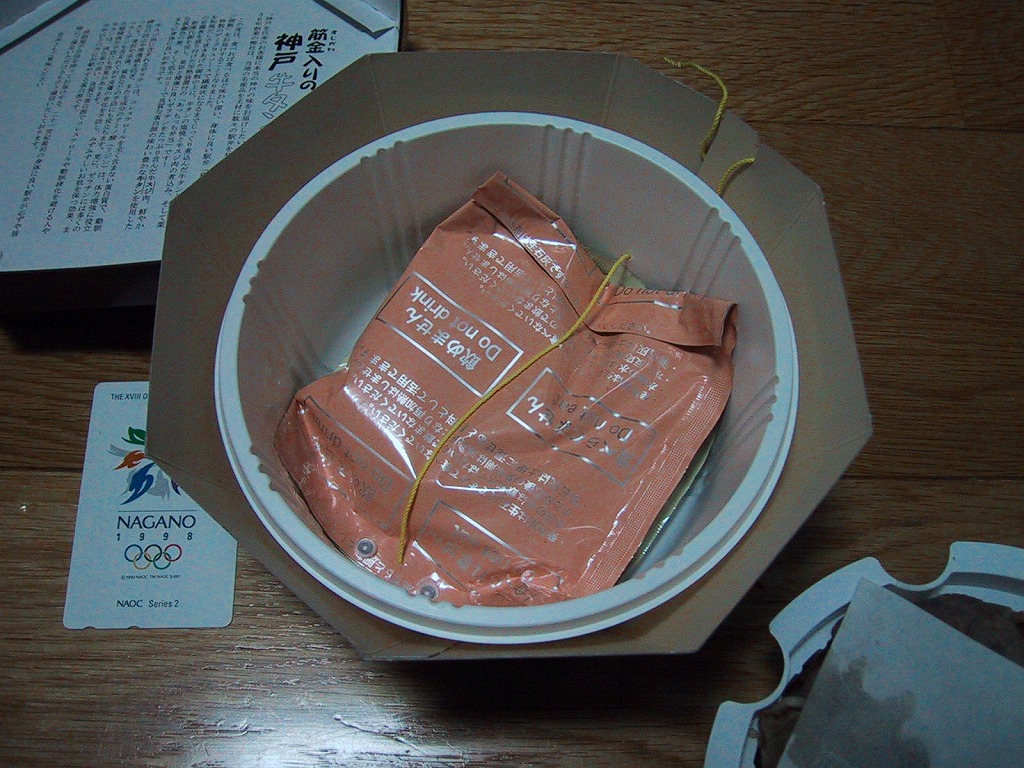 1988(昭和63)年の発売。大きく丸い容器の中身は御飯と牛すき焼きにカイワレなどの薬味と生卵。もちろん暖めてすき焼きとして食べるのだが、生卵がゆで卵になっては困るので卵は暖まらない工夫を凝らしてある。