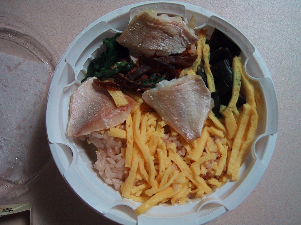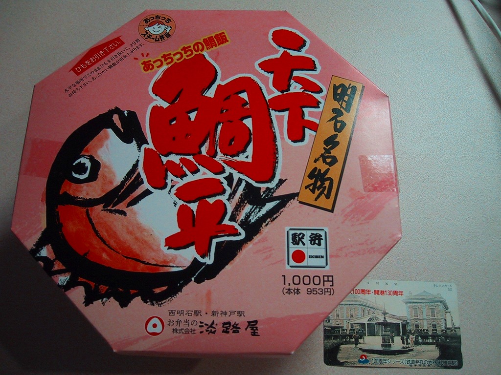 2002(平成14)年に「明石鯛好きめでっ鯛飯」の姉妹品として発売。すり鉢型の八角柱ボール紙製容器の中に、加熱材を底に埋め込んだ円形のプラスティック製容器。中身はめでっ鯛飯と共通で、茶飯の上に錦糸というには太い卵と、鱈の子を混ぜた芽昆布、そして小鯛酒蒸の切り身が3切れ載る。容器側面の黄色いひもを引けば盛大に蒸気が出て8分程度で暖まる。鯛はとても美味いが、芽昆布の着色料はなんとかならないものか。現在は販売されていない模様。