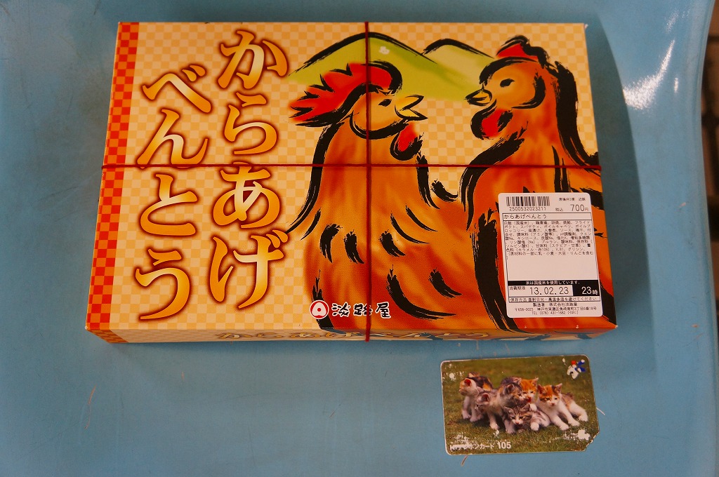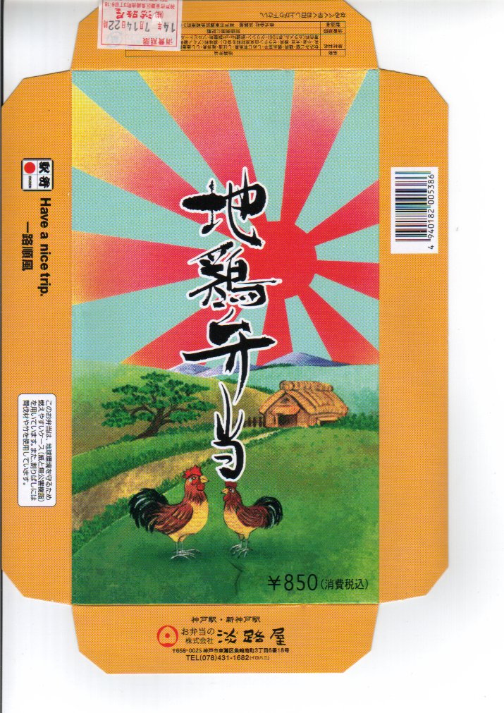 2012年か2013年に発売か。小粒に刻んだ日の丸俵飯に鶏唐揚4個、焼鮭、玉子焼、フライドポテト、煮キャベツ、ブロッコリー、スパゲティ、柴漬けなどを添える。からあげべんとうと考えると鶏の固さと少なさに文句が出るが、鶏唐揚入り幕の内駅弁と考えれば廉価で分量十分。それでもやっぱり、鶏唐揚は神戸の駅弁屋の得意料理ではない感じ。