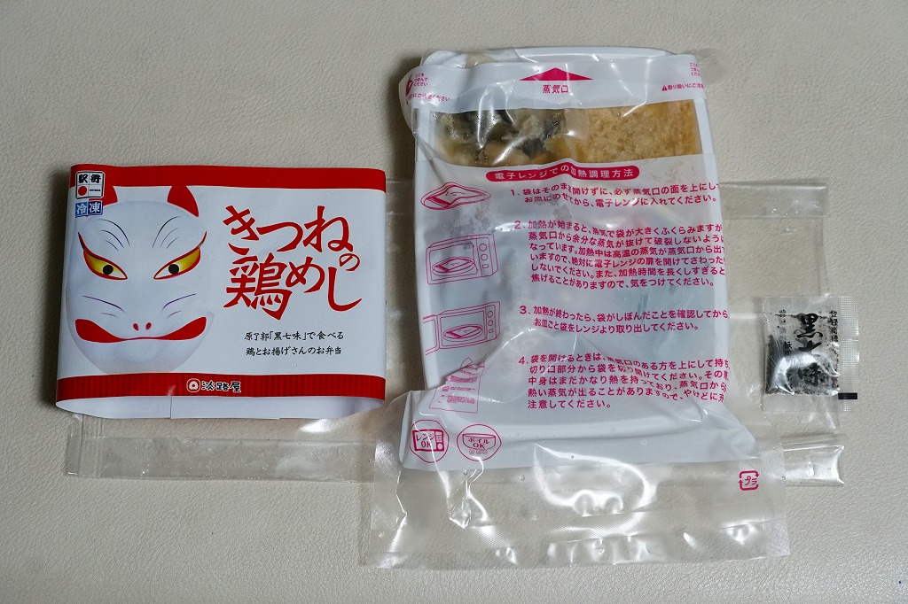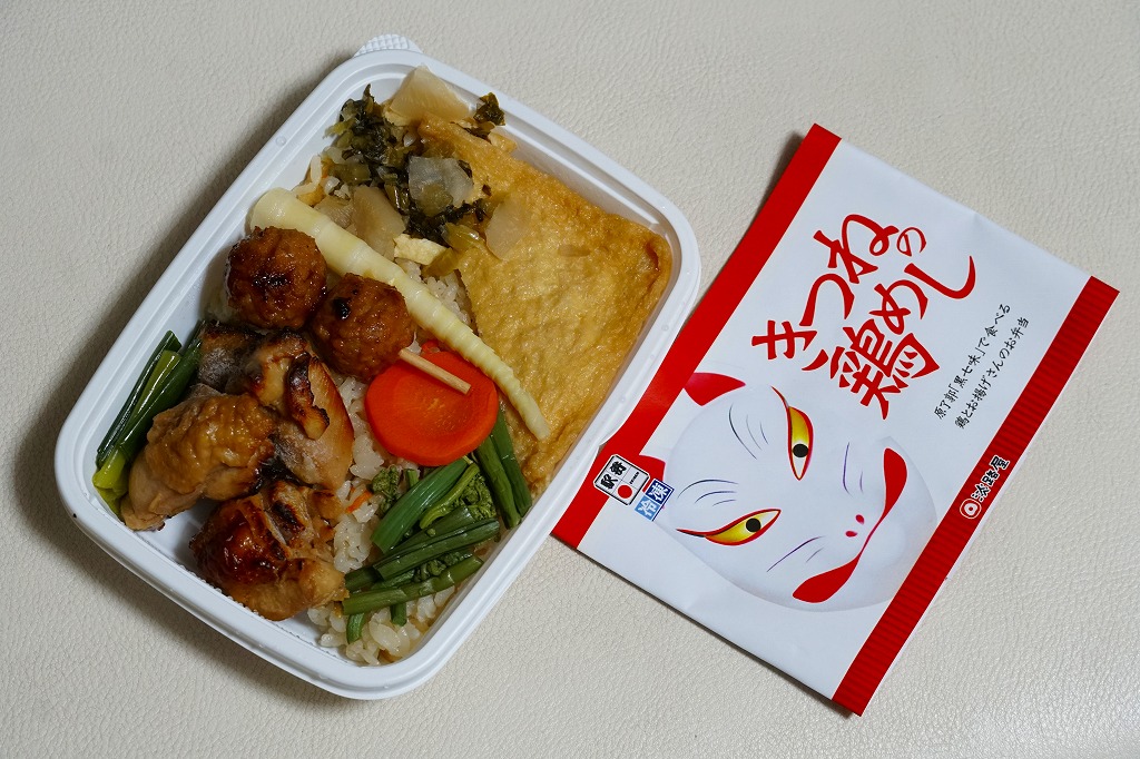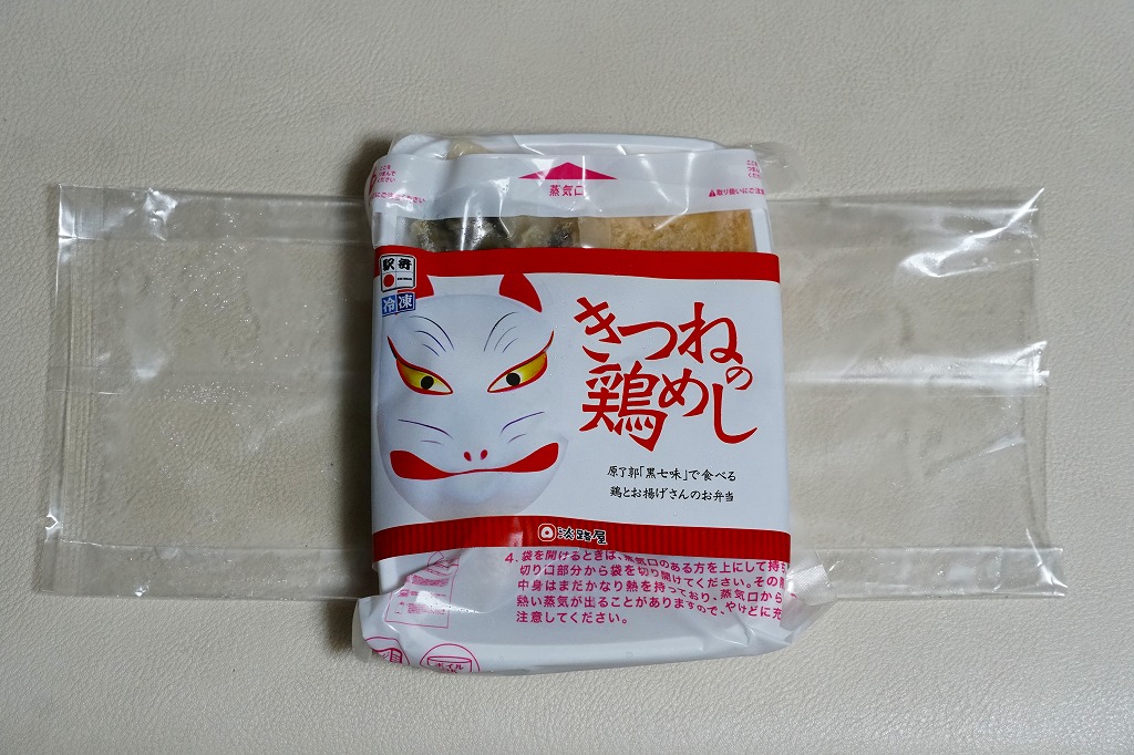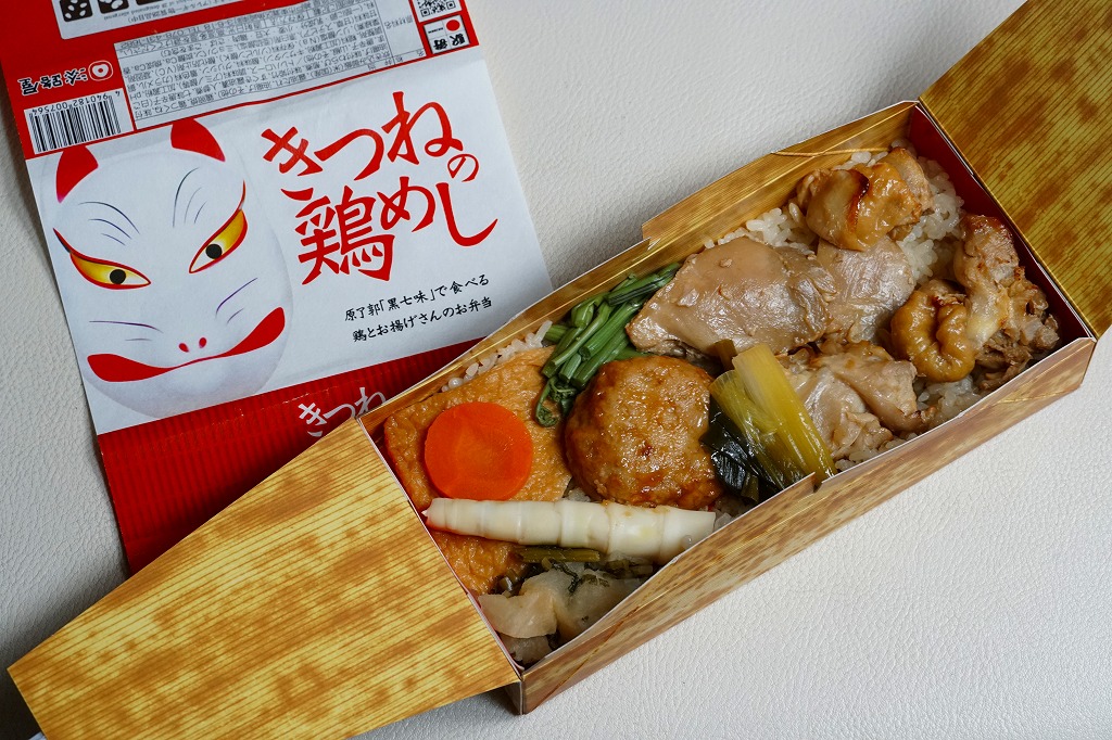 電子レンジ対応の白いプラ製トレーに、油揚げの炊込飯を詰め、鶏照焼、油揚げ、鶏つくね、わらび、姫竹、すぐき、ネギ、ニンジンを散らし、空気を抜いてプラ袋に密封し、駅弁マークのある掛紙を巻く。中身も掛紙の絵柄も、上記の駅弁「きつねの鶏めし」と同じ。加熱でアツアツでも常温でも、駅弁と同じ味がした。駅で買って道中で食べることはできないが、おいしい非常食として優れるほか、出掛けられない人に旅気分を味わってもらうアイテムにできるかもしれない。賞味期限は製造後約3か月か。