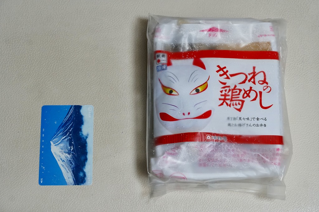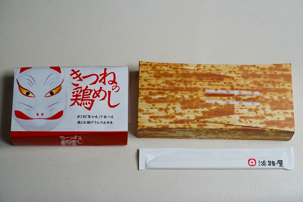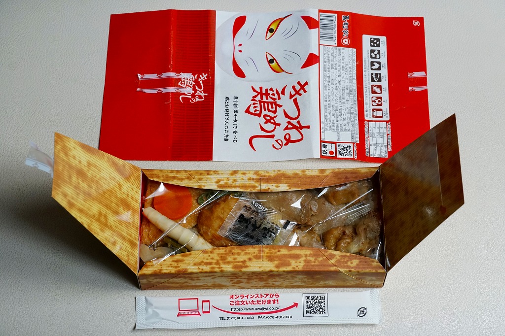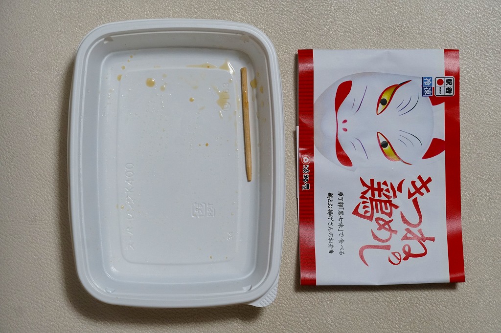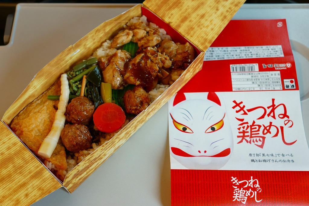 電子レンジ対応の白いプラ製トレーに、油揚げの炊込飯を詰め、鶏照焼、油揚げ、鶏つくね、わらび、姫竹、すぐき、ネギ、ニンジンを散らし、空気を抜いてプラ袋に密封し、駅弁マークのある掛紙を巻く。中身も掛紙の絵柄も、上記の駅弁「きつねの鶏めし」と同じ。加熱でアツアツでも常温でも、駅弁と同じ味がした。駅で買って道中で食べることはできないが、おいしい非常食として優れるほか、出掛けられない人に旅気分を味わってもらうアイテムにできるかもしれない。賞味期限は製造後約3か月か。