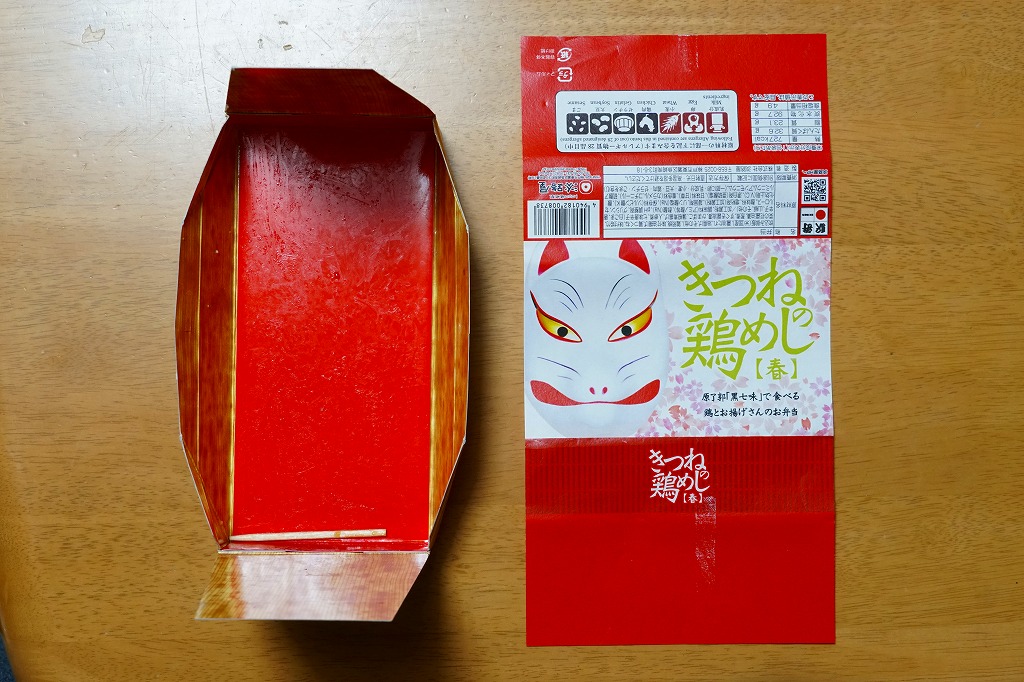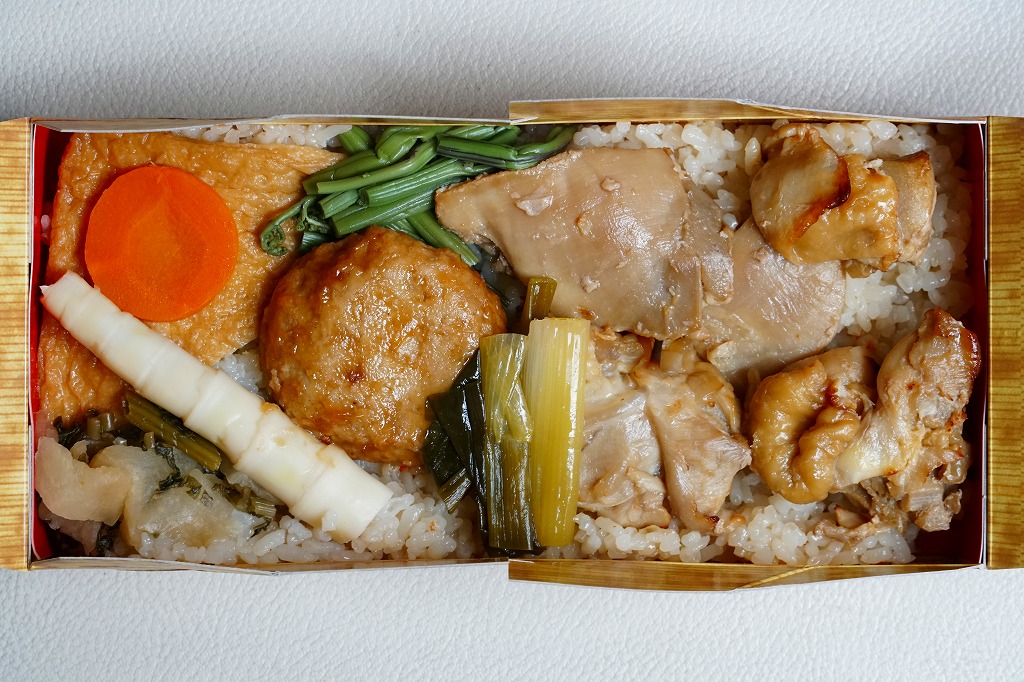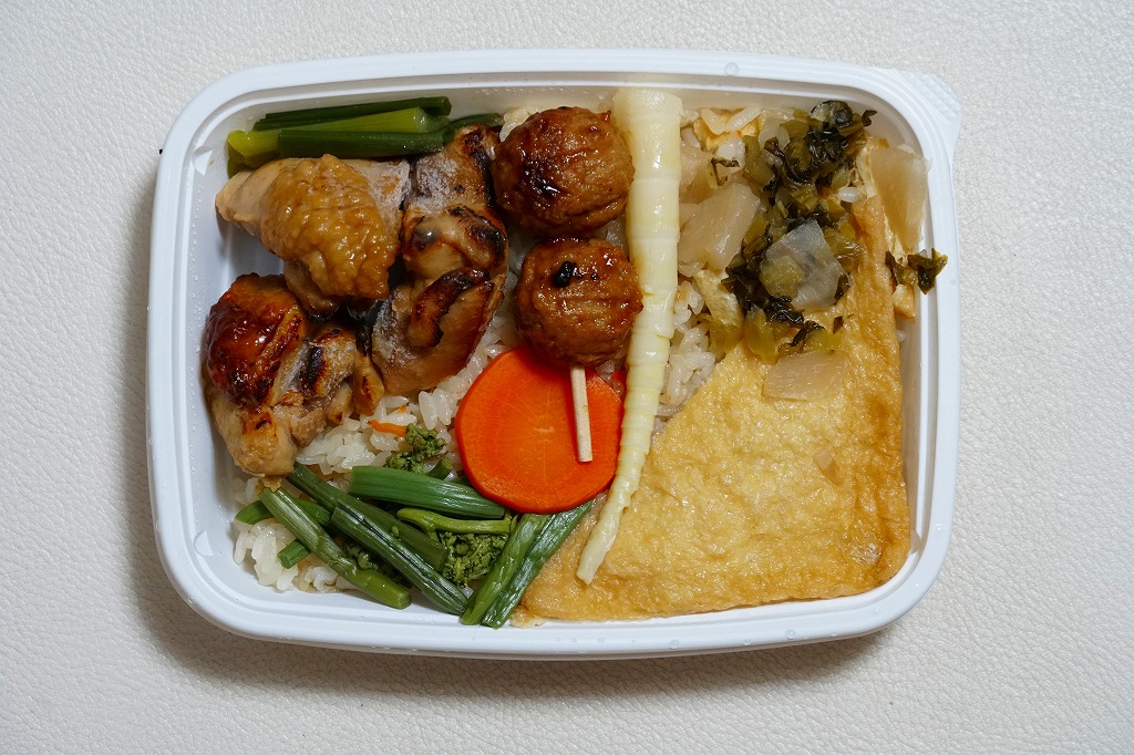 油揚げの炊込飯を詰め、鶏照焼、油揚げ、鶏つくね、すぐき、ネギ、レンコン素揚げ、ニンジンを散らし、かまぼこと菜の花を詰め、原了郭の黒七味を添付する内容も、従前とほぼ同じ。季節で中身を変えたはずが、その違いにはほぼ気が付かない、油揚げ風味の鶏飯。価格は2021年の発売時で850円、2023年時点で920円、2024年時点で980円、2025年時点で1,050円。
